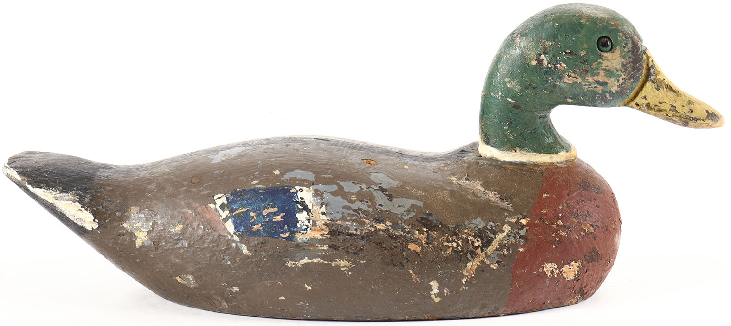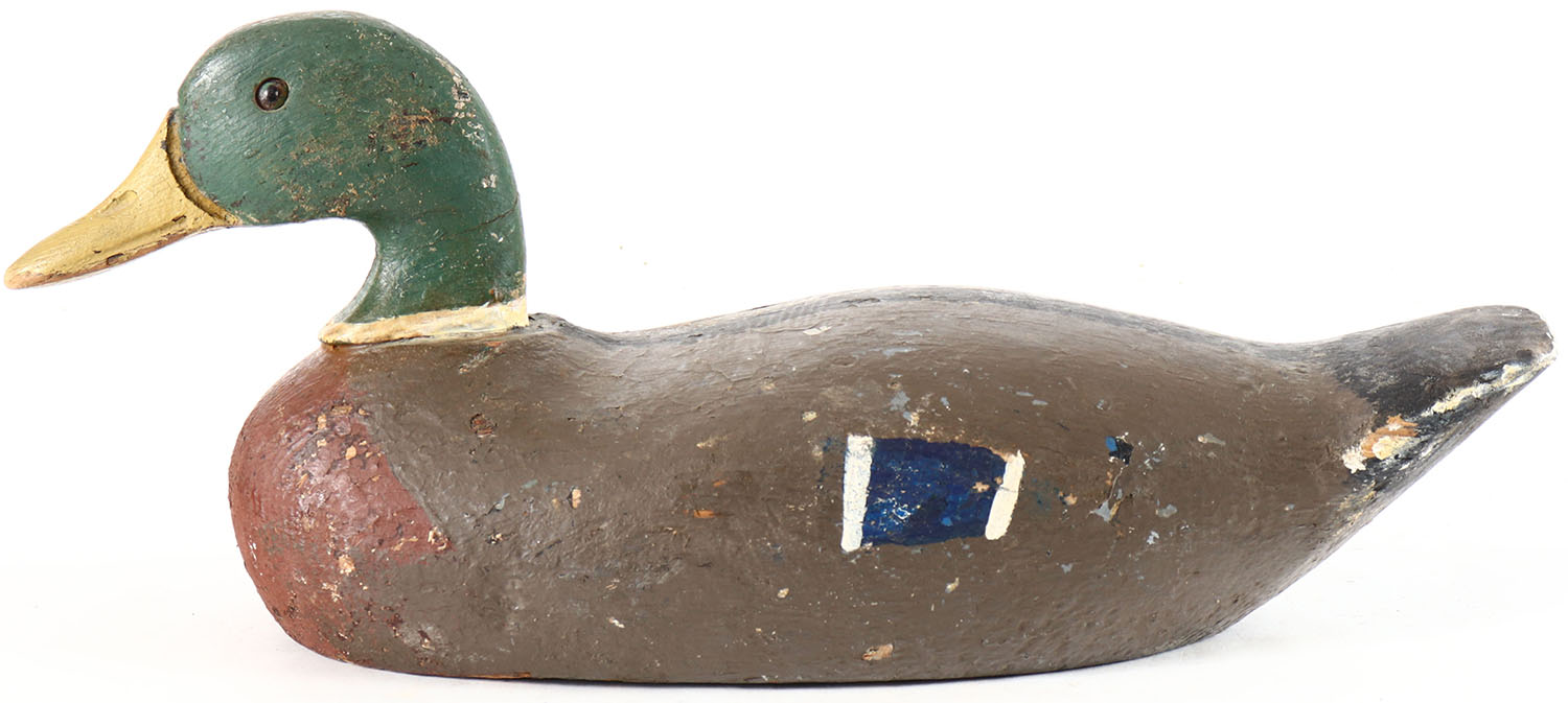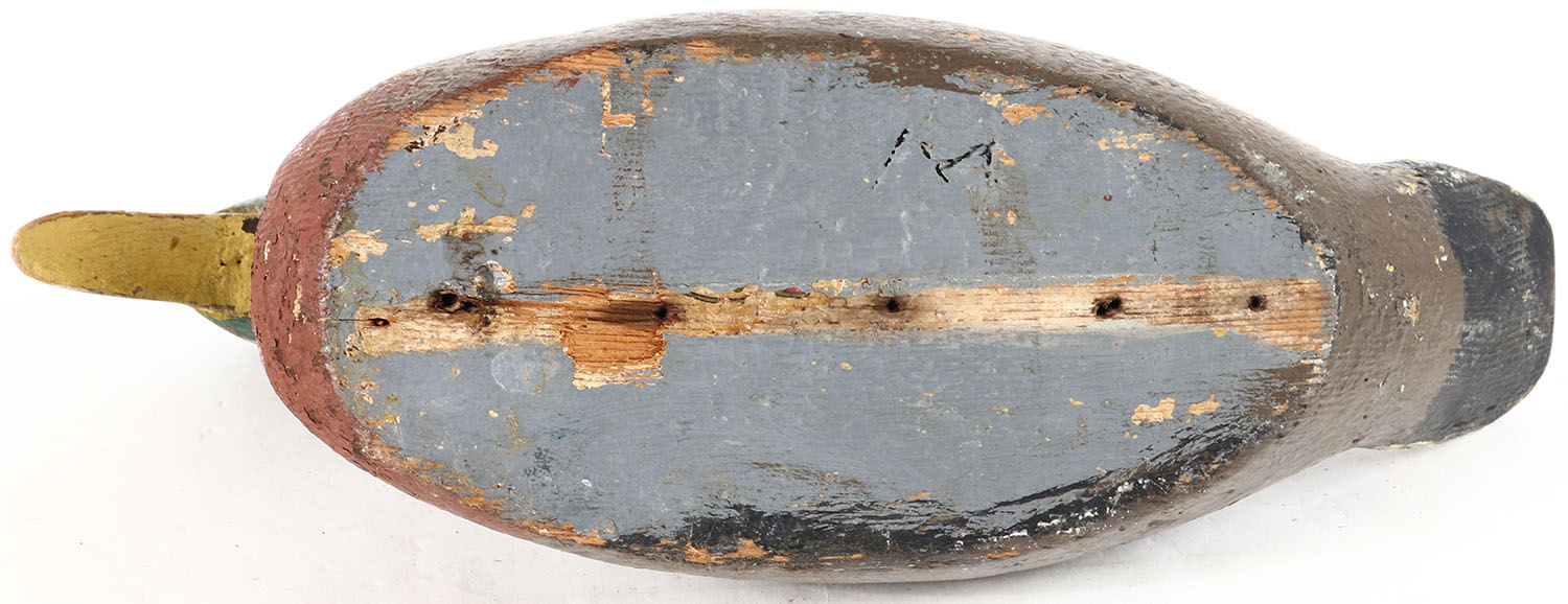 Mallard Drake by unknown maker, glass eyes, solid wood, working repaint, wear to body and paint, has age cracks on bottom. Grade: Very Good - Value: 6 to 10