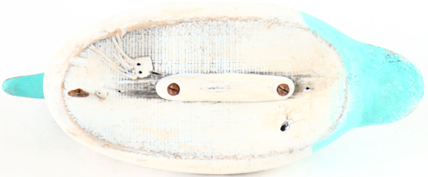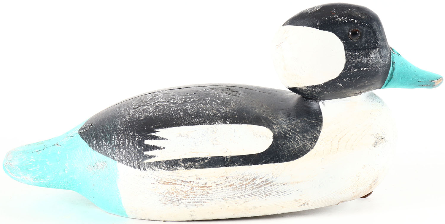 Bufflehead Drake by unknown maker, glass eyes, solid wood, original paint, has age cracks on back. Grade: Very Good + - Value: 10 to 20