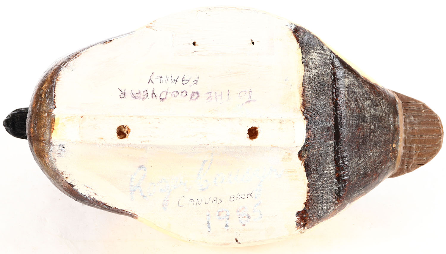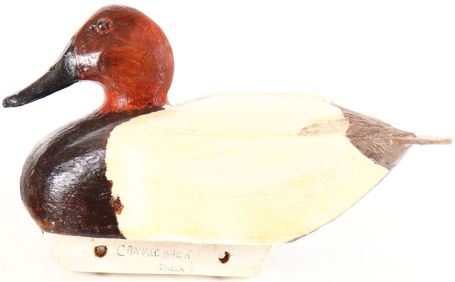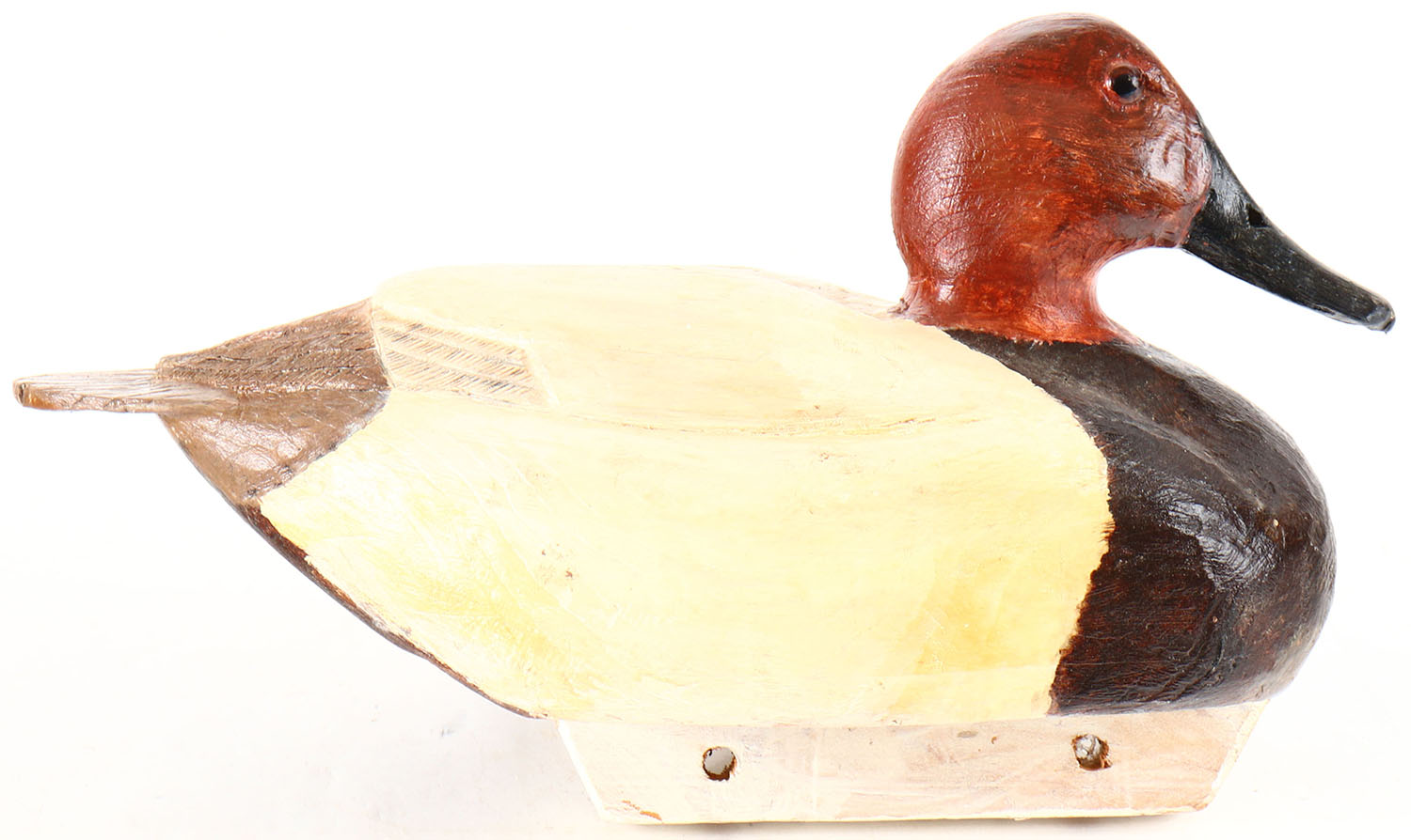 Canvasback Drake by unknown maker with illegible signature on bottom, glass eyes, hollow wood, possible repaint, structurally excellent. Grade: Excellent - Value: 10 to 30