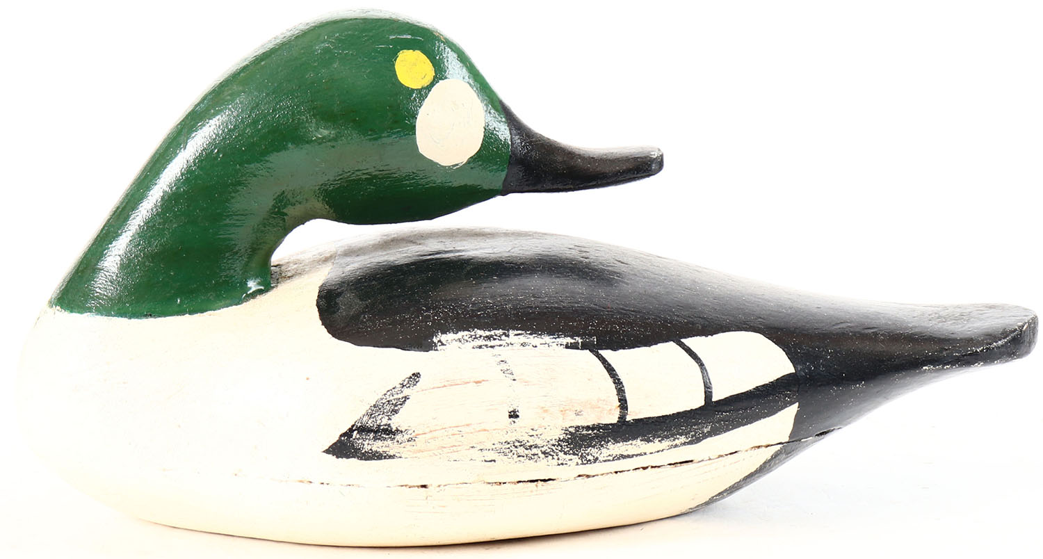 Preening Goldeneye Drake by unknown maker, painted eyes, solid wood, original paint, structurally excellent. Grade: Excellent - Value: 10 to 30