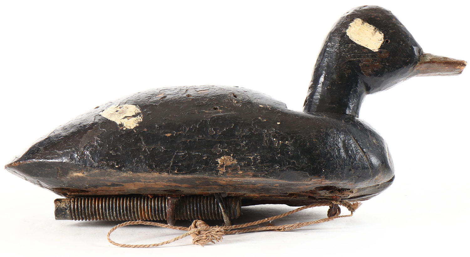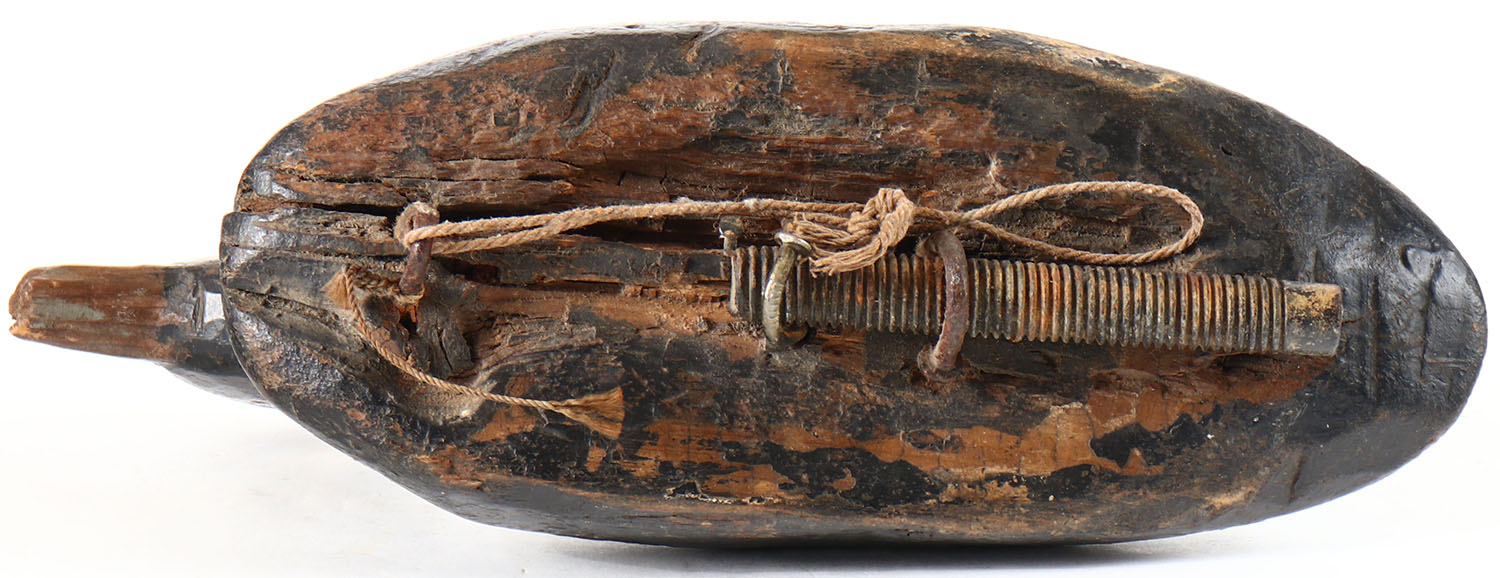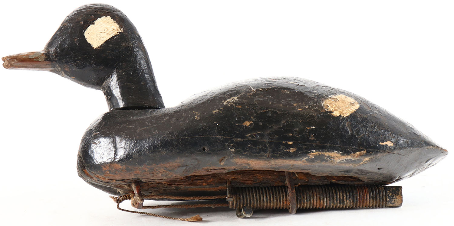 Bufflehead Hen by unknown maker, painted eyes, solid wood, original paint, has age cracks on back and bottom. Grade: Very Good + - Value: 10 to 30