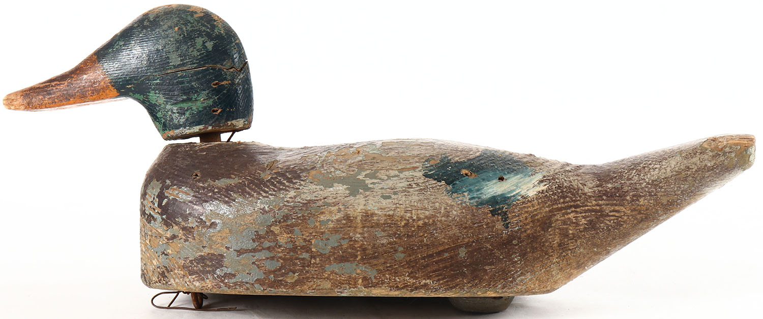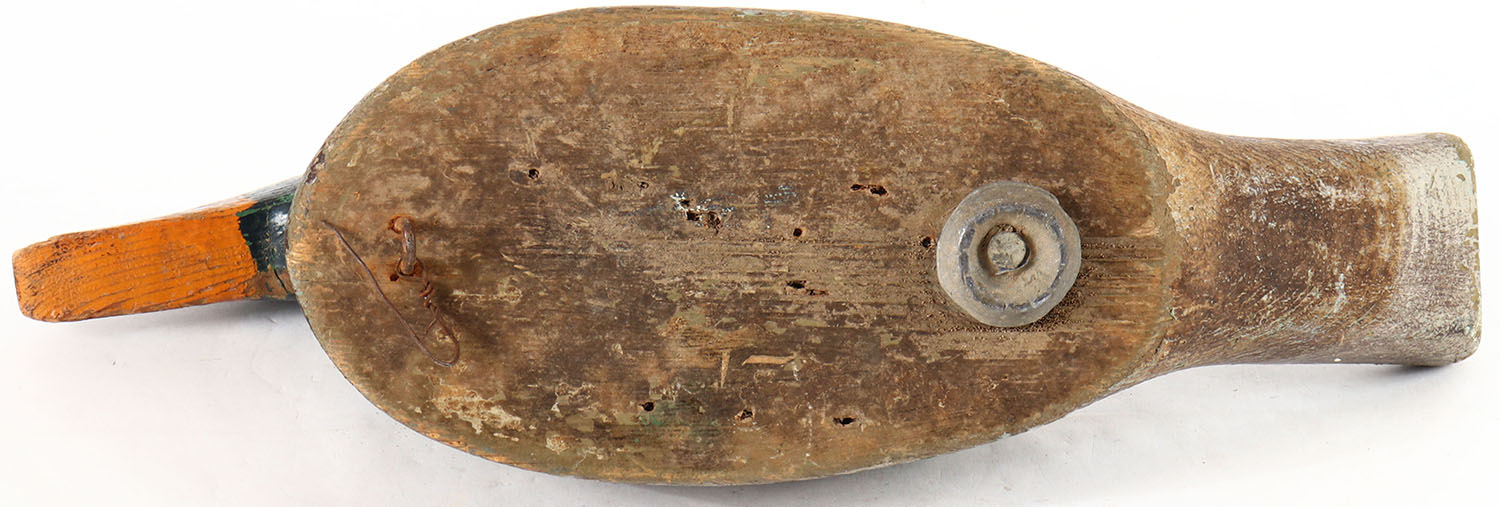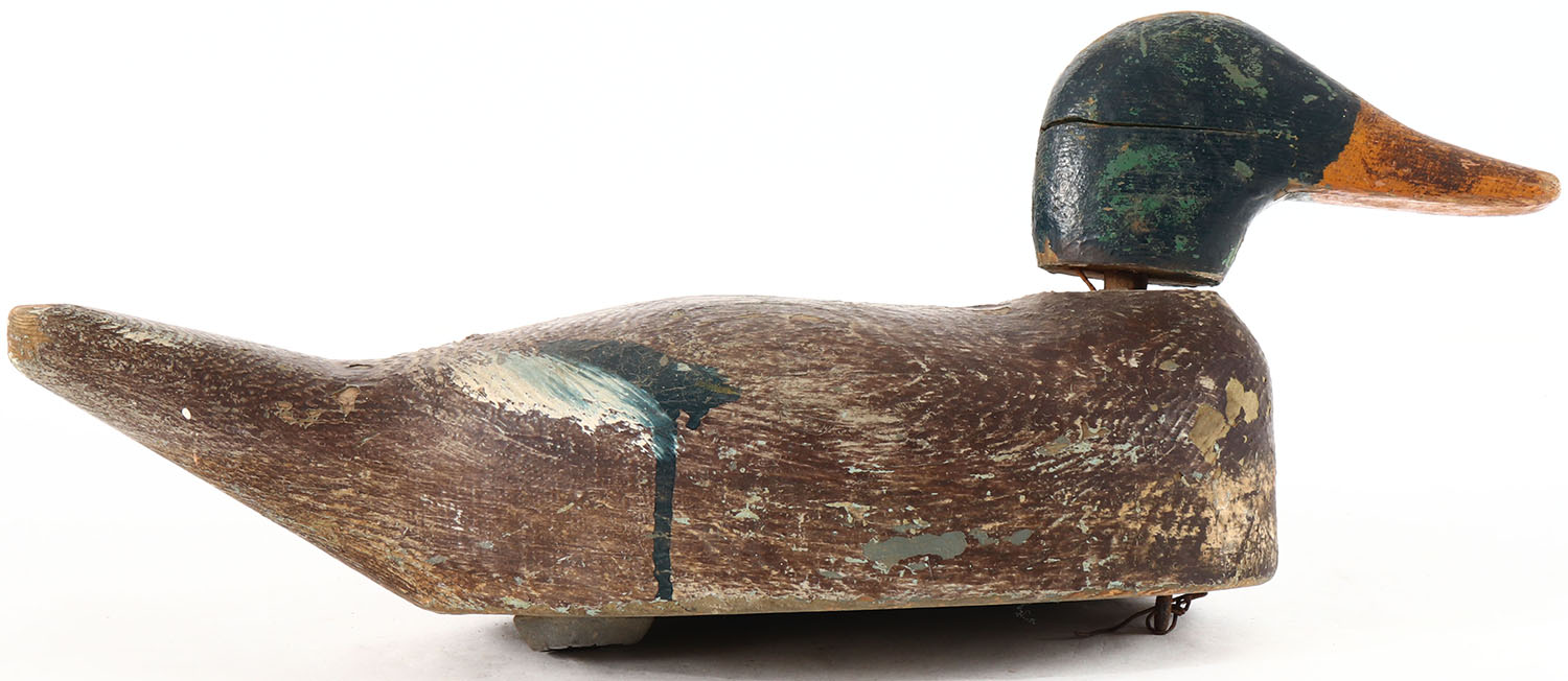 Mallard Drake by unknown maker, no eyes, solid wood, original paint, has age cracks on body and head, head is loose. Grade: Very Good + - Value: 10 to 20