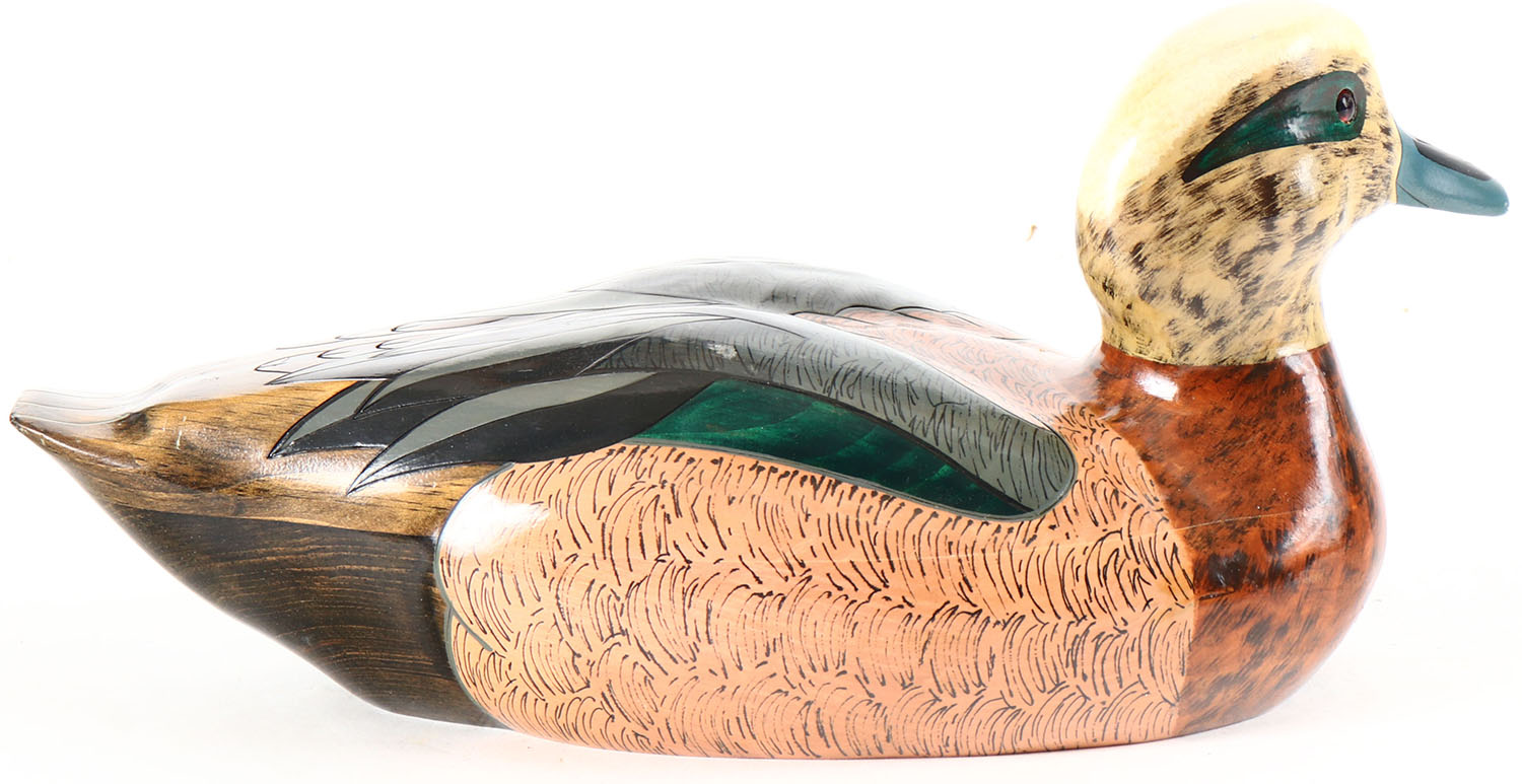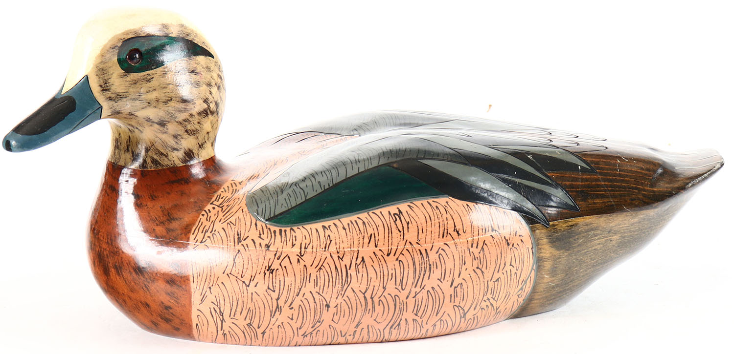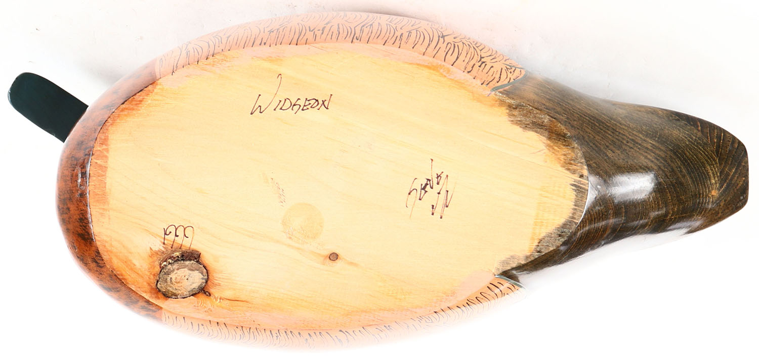Widgeon Drake by unknown maker with illegible signiture, glass eyes, solid wood, original paint, structurally excellent. Grade: Excellent ++ - Value: 10 to 30