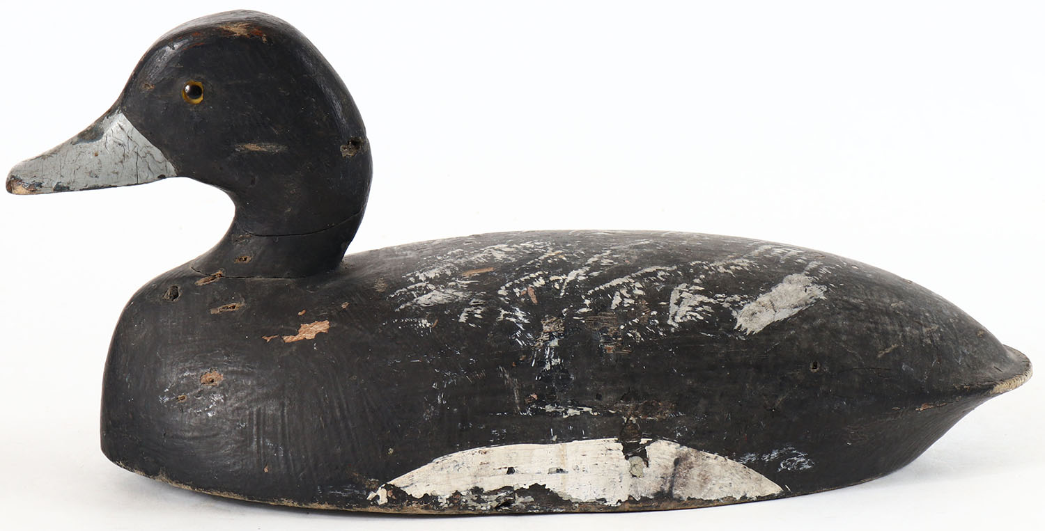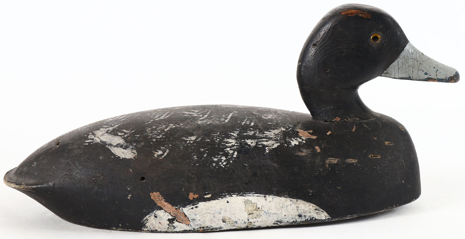 Bluebill Drake by unknown maker, glass eyes, solid wood, original paint, wear to body. Grade: Very Good - Value: 10 to 20