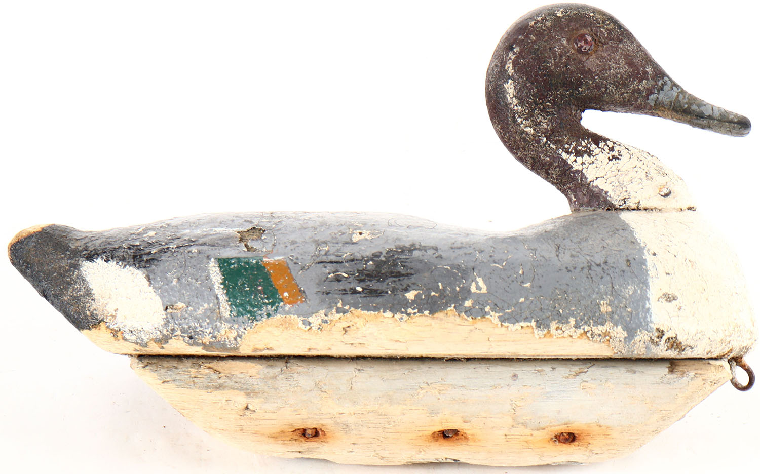Pintail Drake by unknown maker, tack eyes, solid wood, original paint, age cracks on entire body. Grade: Very Good + - Value: 10 to 20