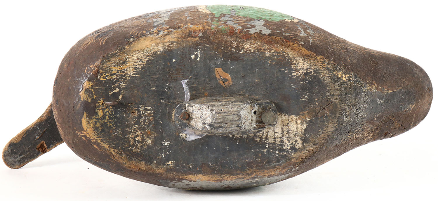 Bluebill Hen by unknown factory, glass eyes, solid wood, working repaint, has paint cracks on body, head is loose. Grade: Very Good - Value: 10 to 20