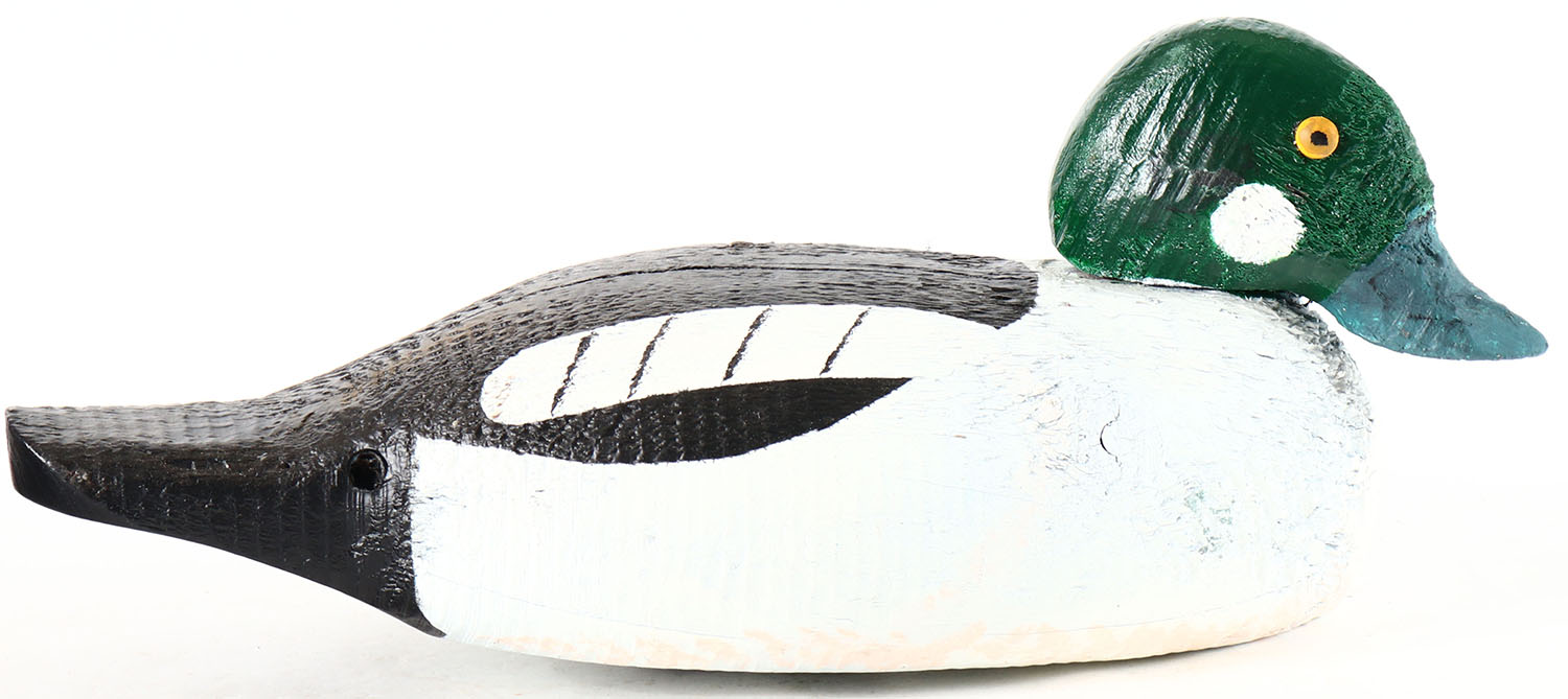 Goldeneye Drake by unknown MS factory, glass eyes, solid wood, working repaint, age cracks on back. Grade: Very Good - Value: 10 to 20