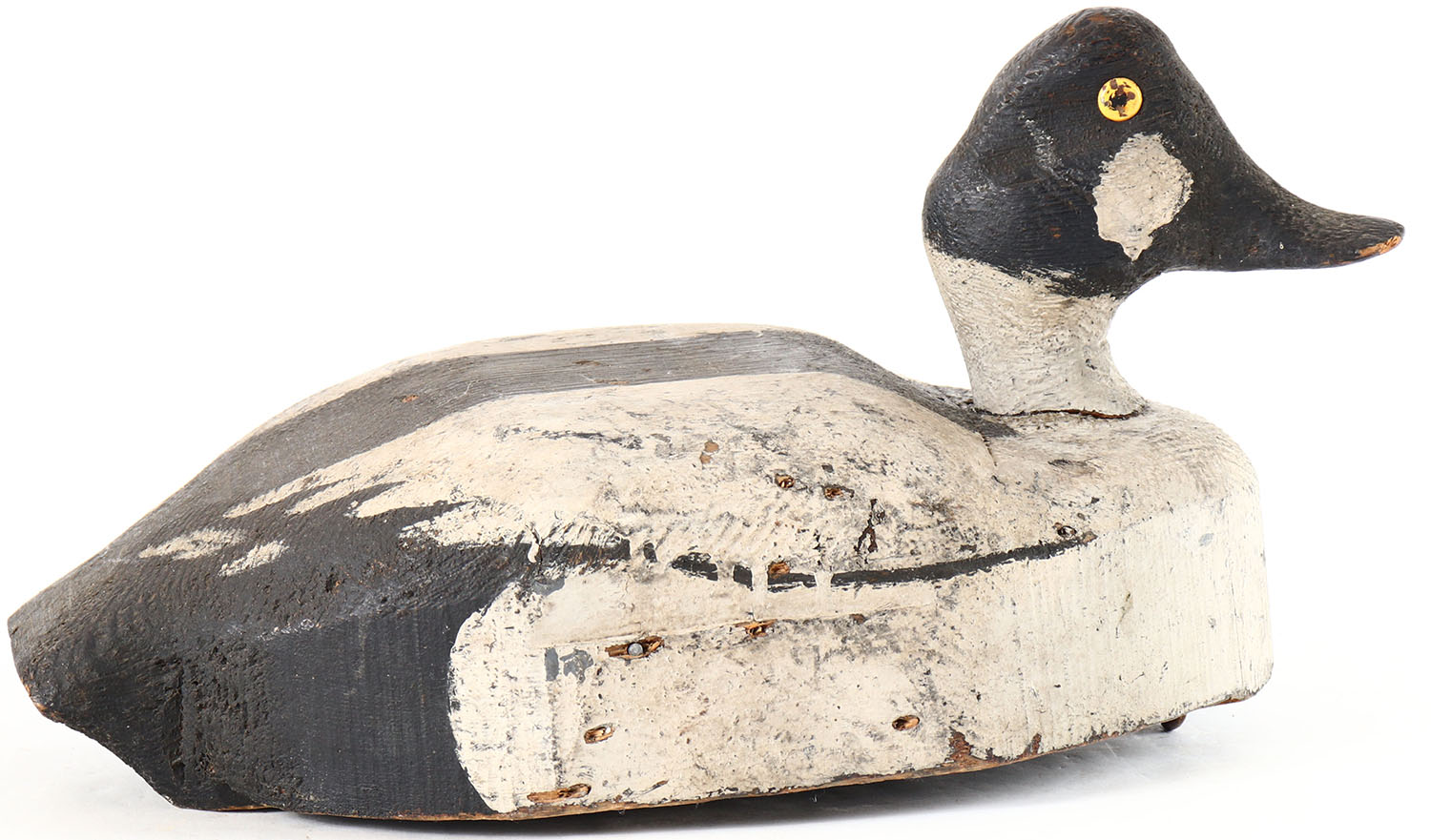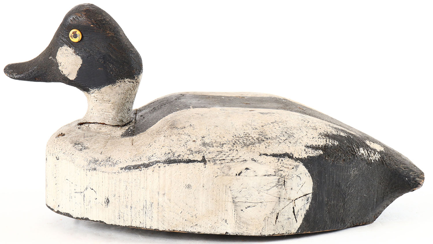Goldeneye Drake by unknown maker, glass eyes, solid wood, original paint, age cracks on back. Grade: Very Good + - Value: 16 to 30