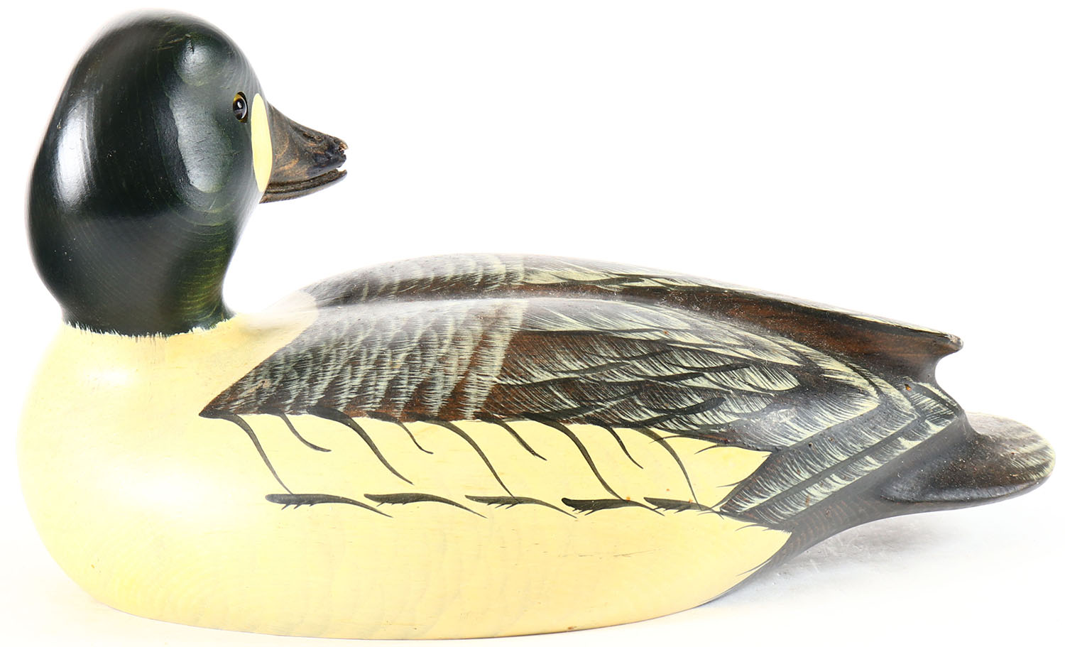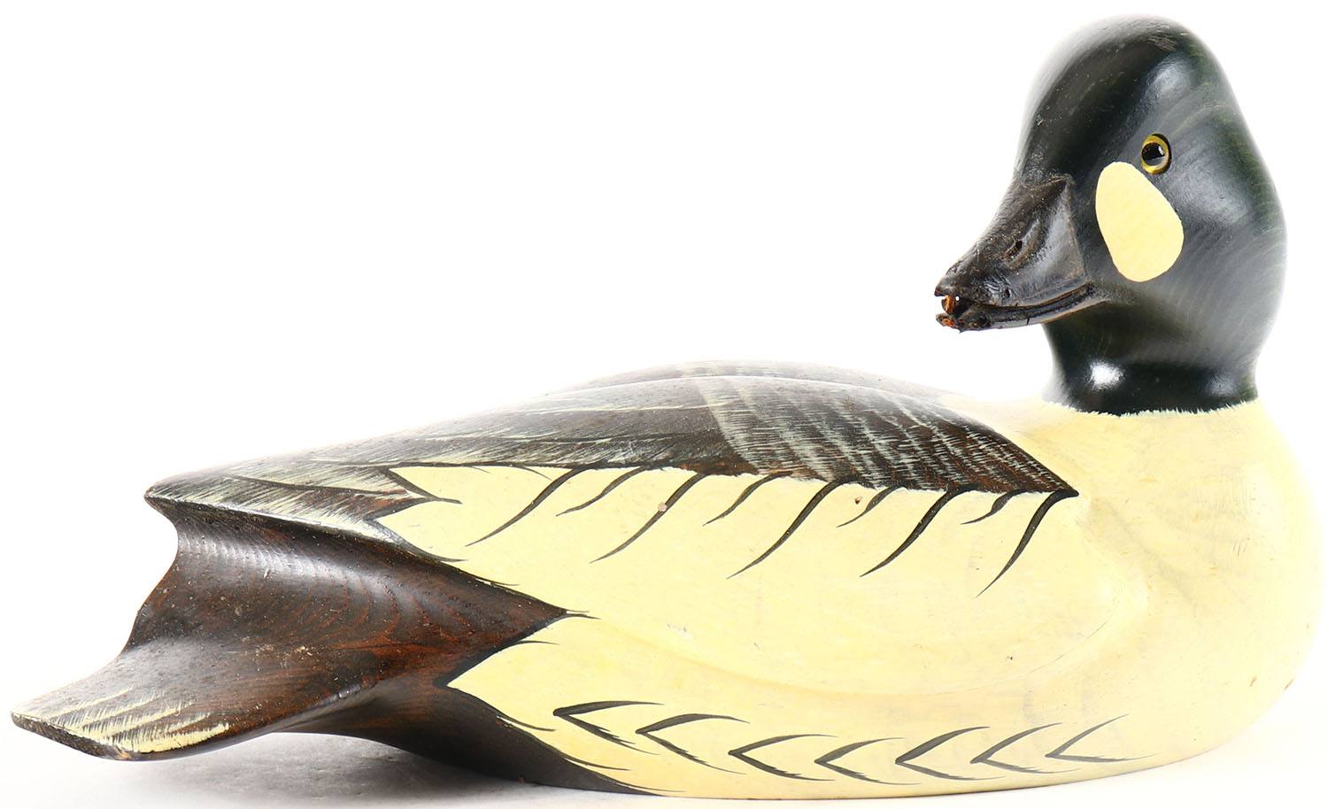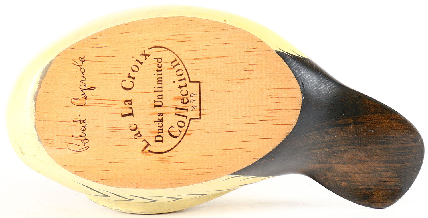 Preening Goldeneye Drake by Robert Capriola, Lac La Croix, Ducks Unlimited, glass eyes, solid wood, original paint, structurally excellent, branded by ROBERT CAPRIOLA DUCKS UNLIMITED on bottom. Grade: Excellent ++ - Value: 10 to 40