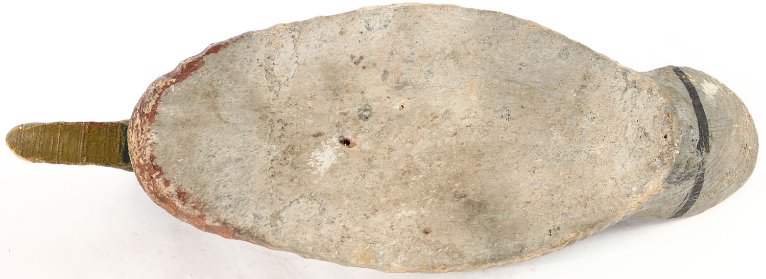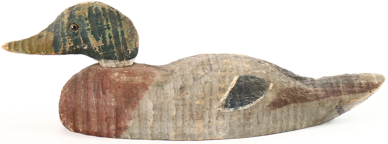 Mallard Drake by a MS factory, glass eyes, solid wood, original paint with typical wear, head is loose. Grade: Very Good ++ - Value: 10 to 20