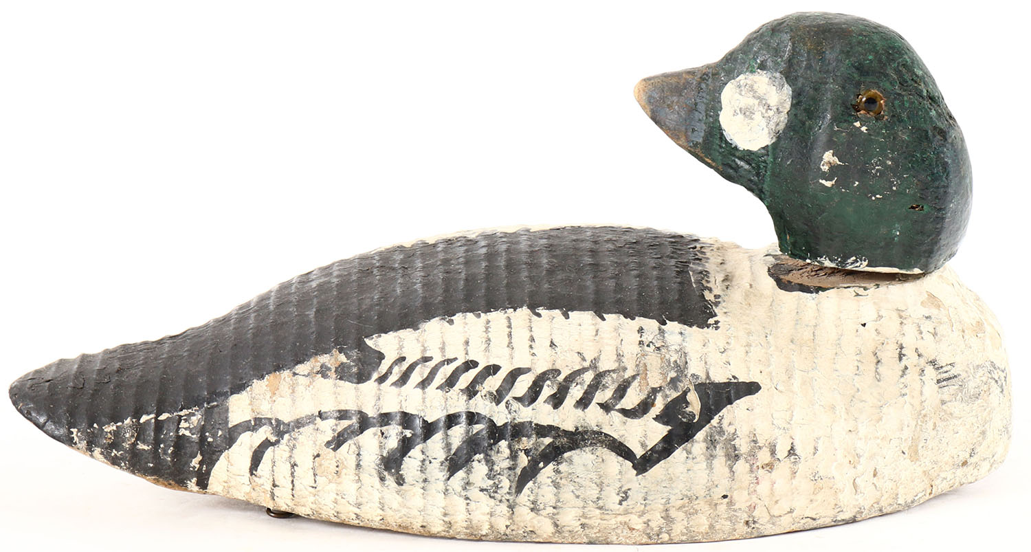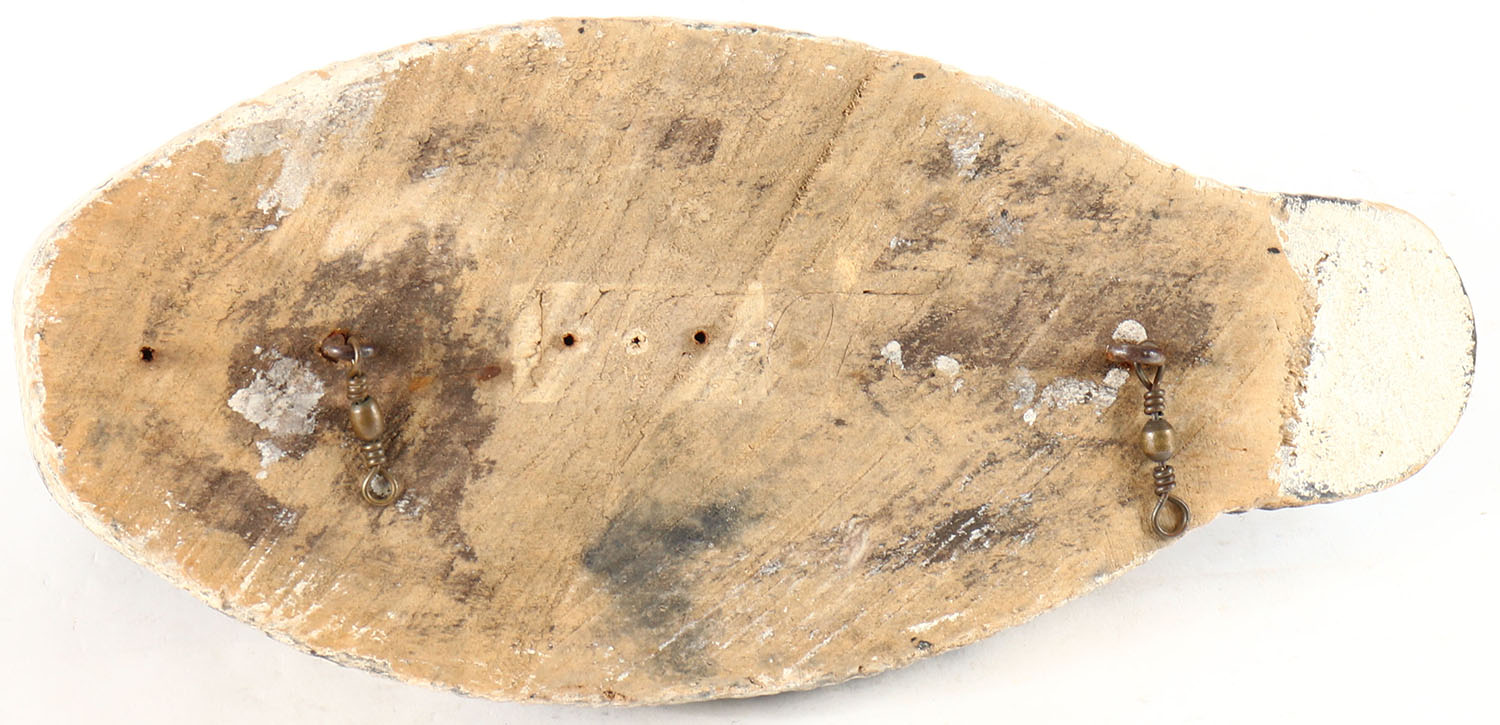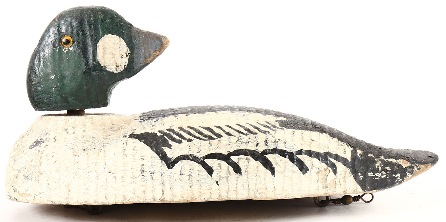 Preening Goldeneye Drake by Animal Trap, glass eyes, solid wood, working repaint, head is loose. Grade: Very Good + - Value: 10 to 20