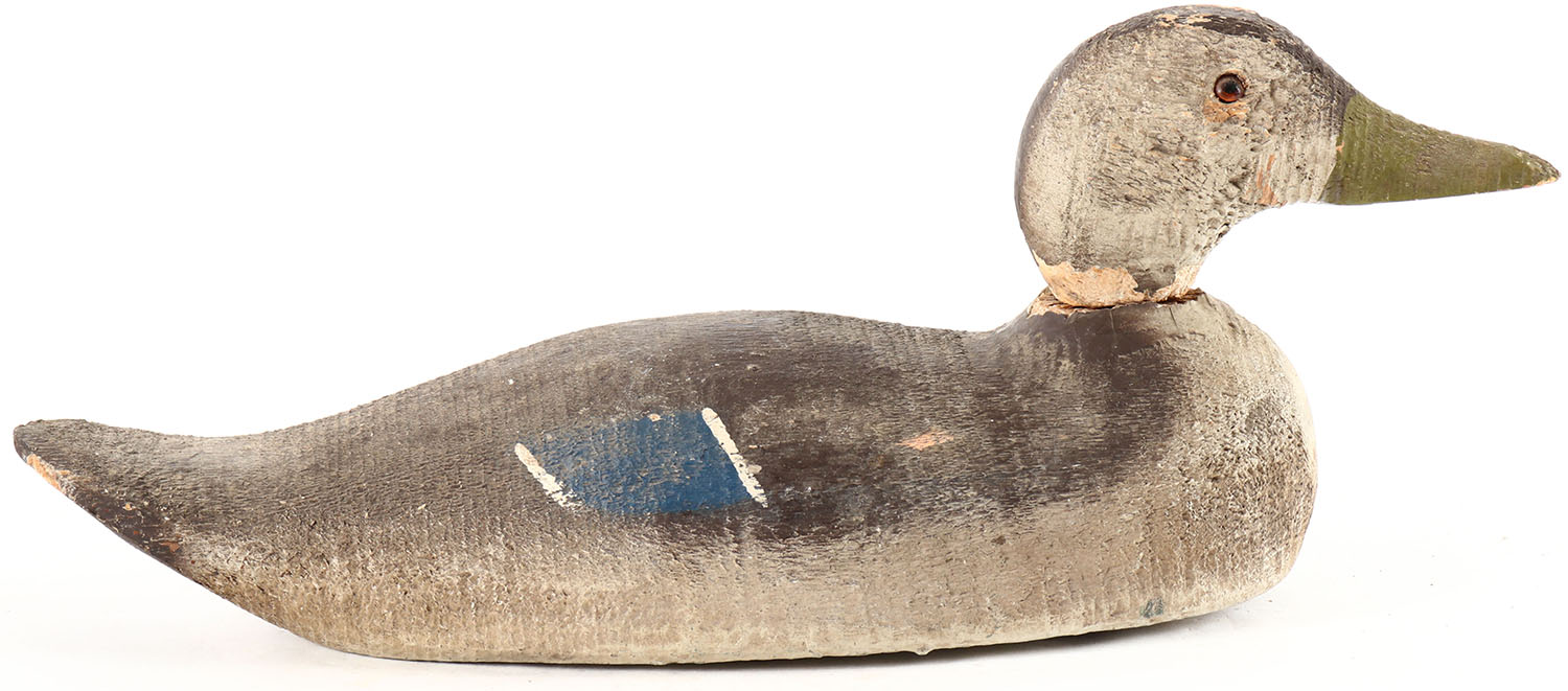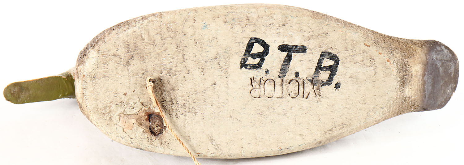 Black Duck by Victor Decoys, glass eyes, solid wood, original paint, branded by VICTOR DECOYS on bottom, head is loose. Grade: Very Good + - Value: 10 to 20