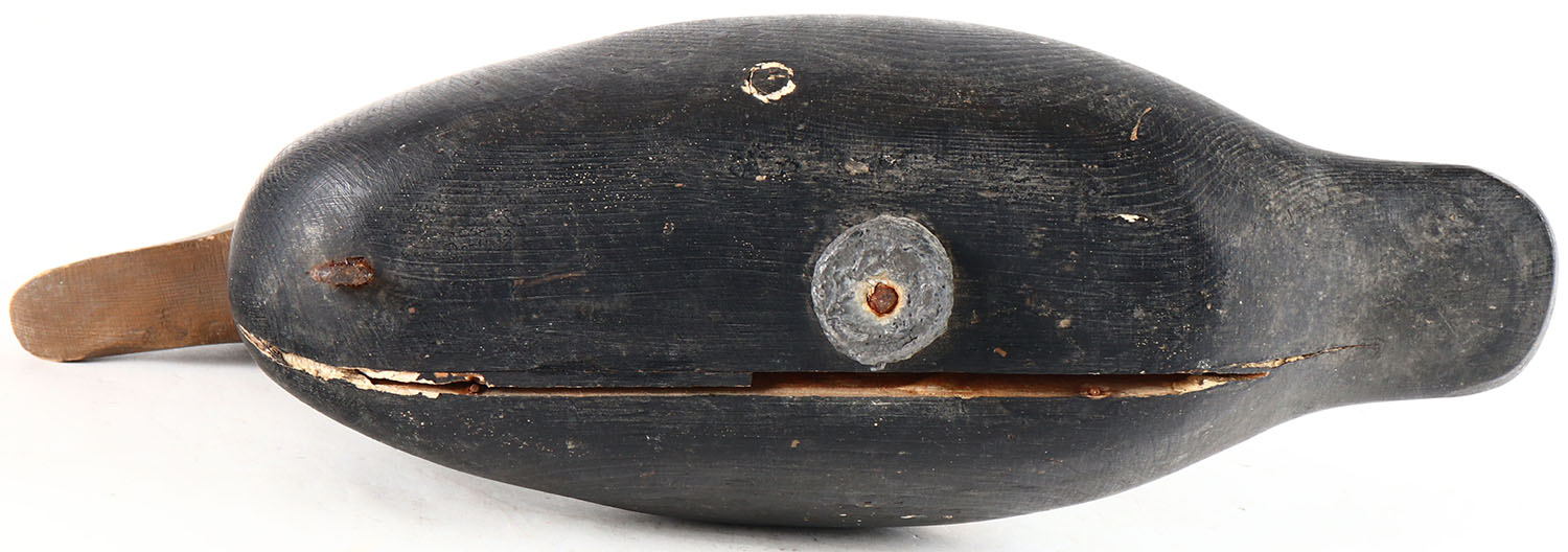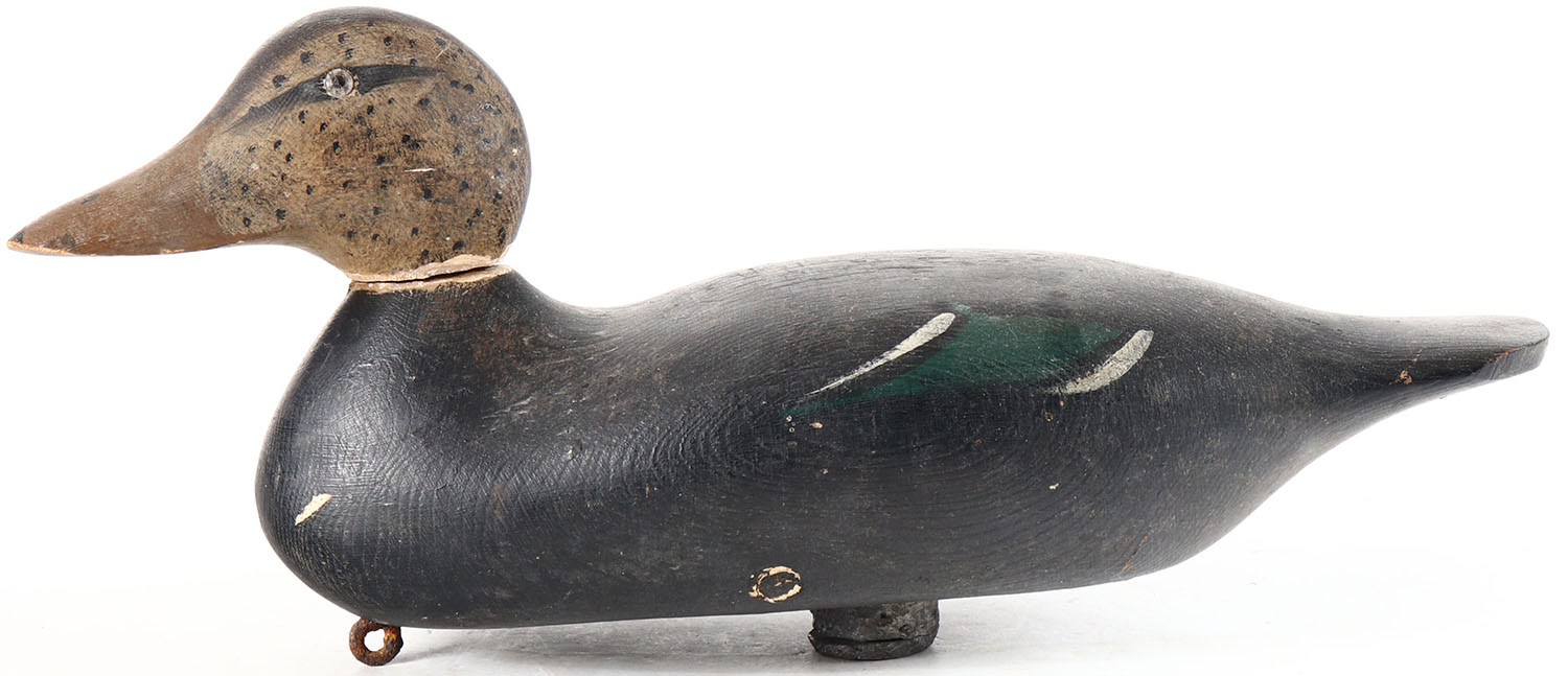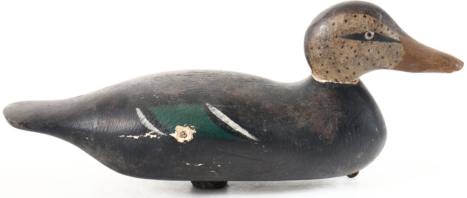 Black Duck by Mason Decoy Company, Detroit, MI, 1896-1924, late model, glass eyes, original paint, age cracks on back and bottom, head is loose. Grade: Very Good + - Value: 20 to 100