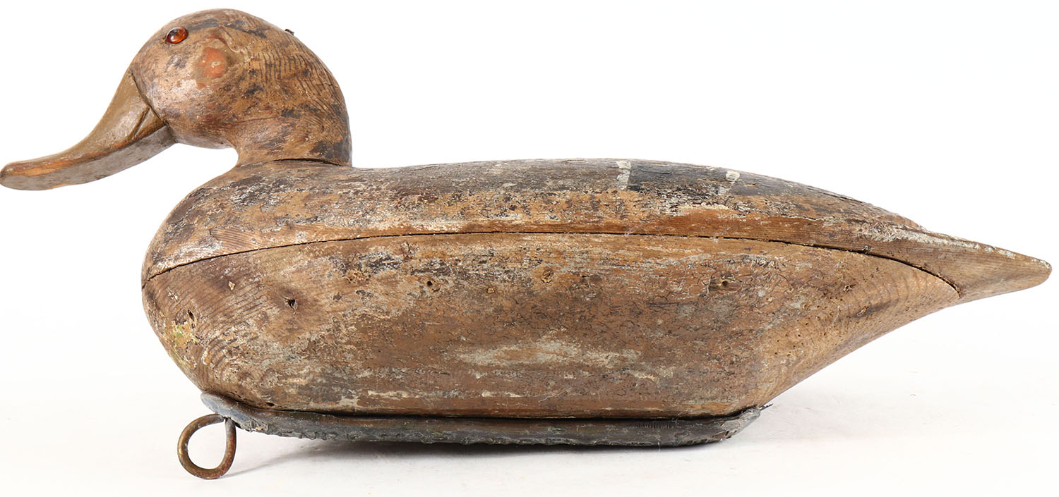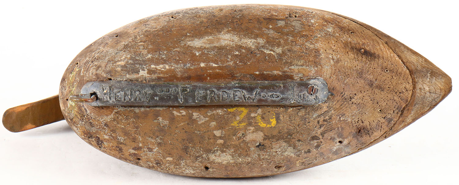 Hen Mallard by an Illinois River carver with a Henry Perdew weight, glass eyes, solid wood, mostly worn original paint, age crack under neck. Grade: Very Good + - Value: 70 to 150