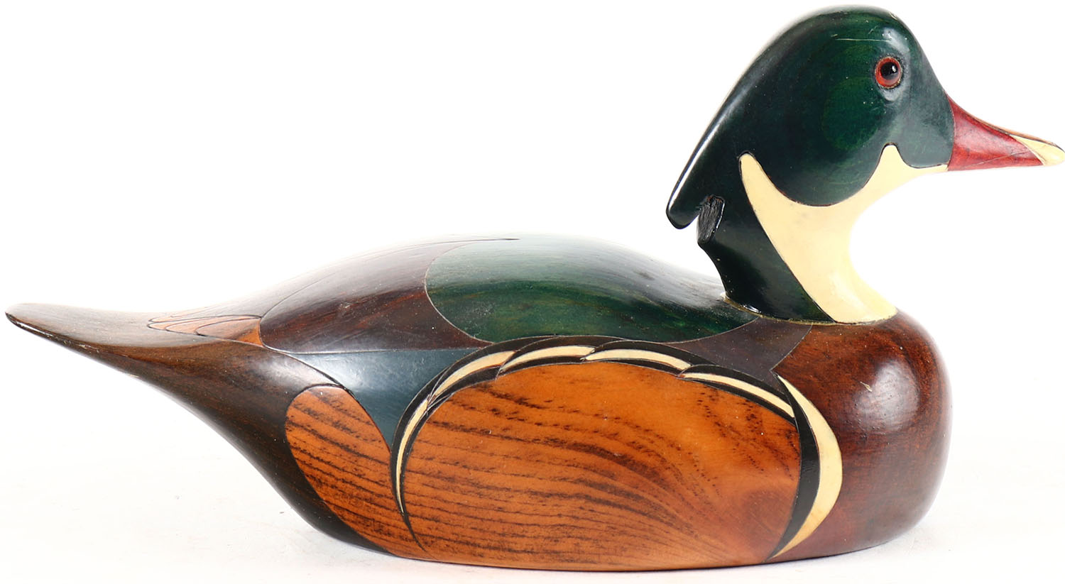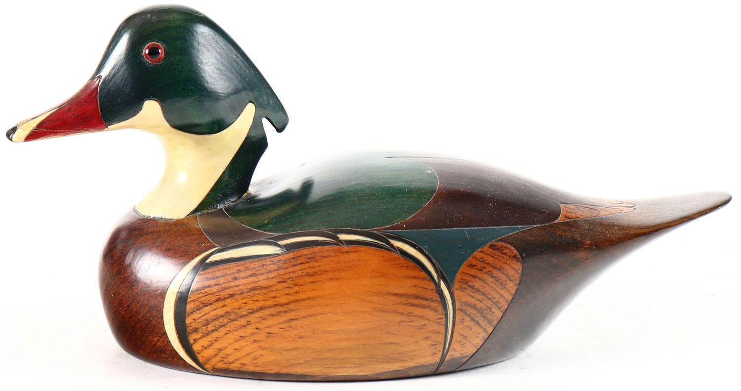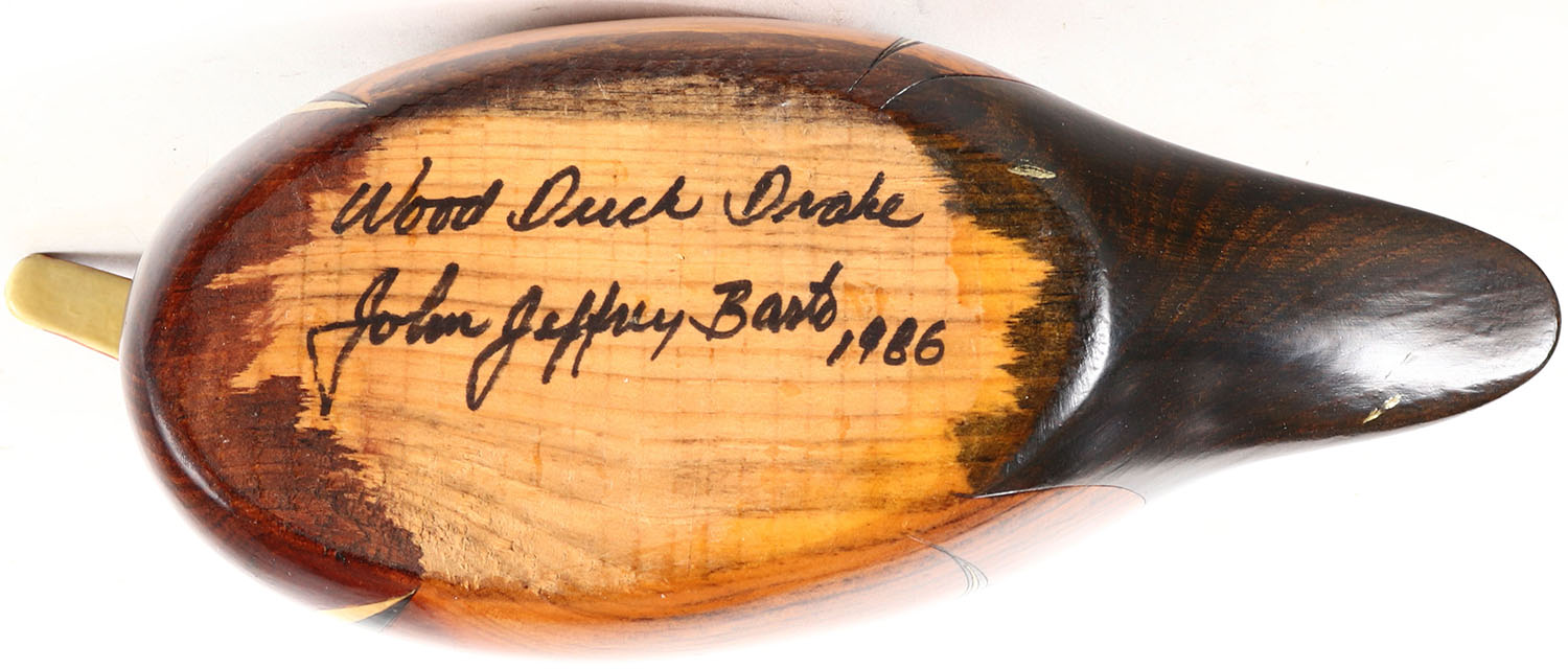 Woodduck Drake by John Jeffery Barto, glass eyes, solid wood, original paint, structurally excellent, signed on bottom by JOHN JEFFERY BARTO. Grade: Excellent - Value: 16 to 30