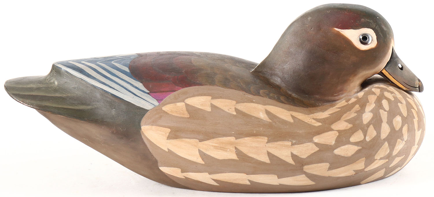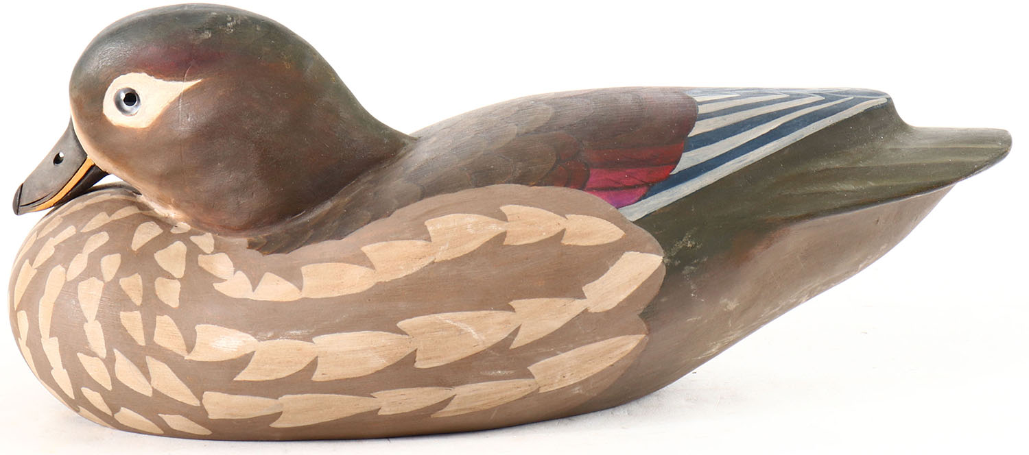 Woodduck Hen by Gary Lawrence, MD, glass eyes, hollow wood, original paint, structurally excellent, maker branded. Grade: Excellent + - Value: 10 to 50
