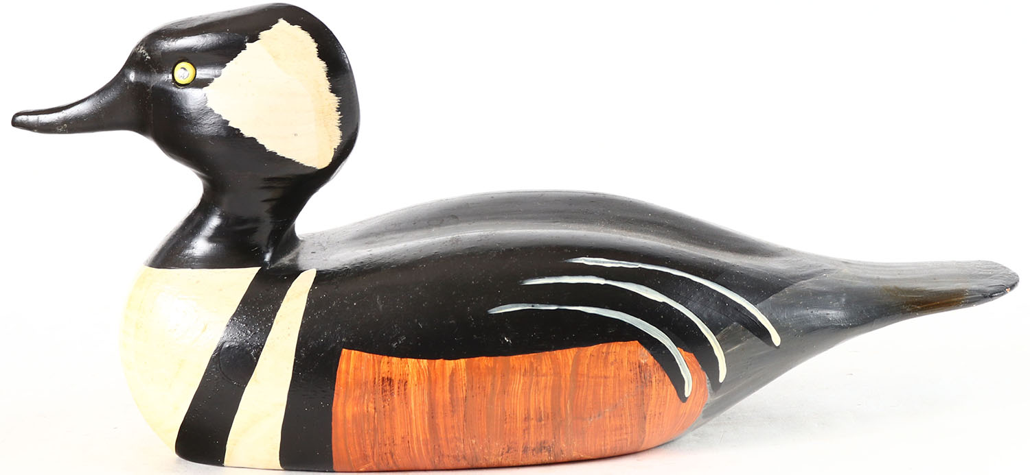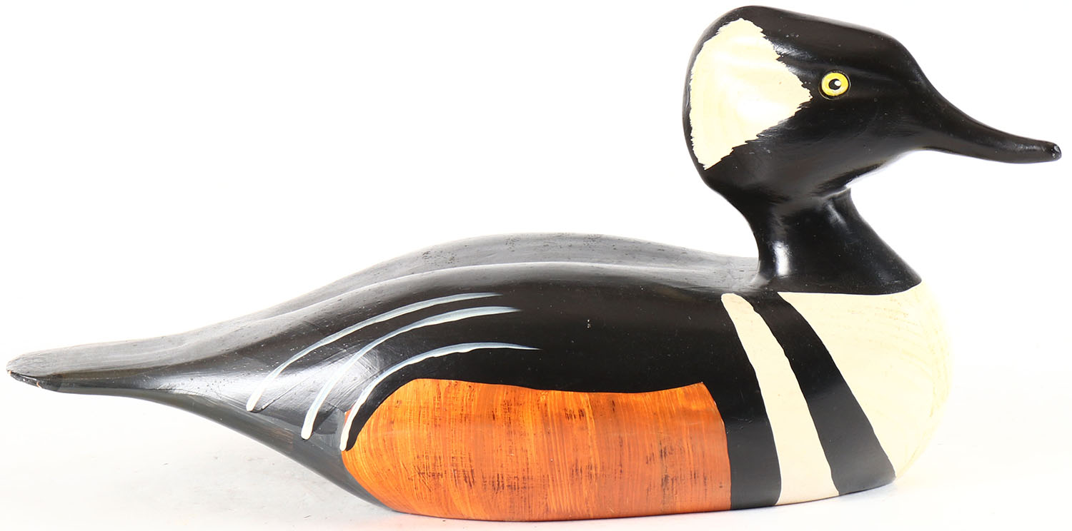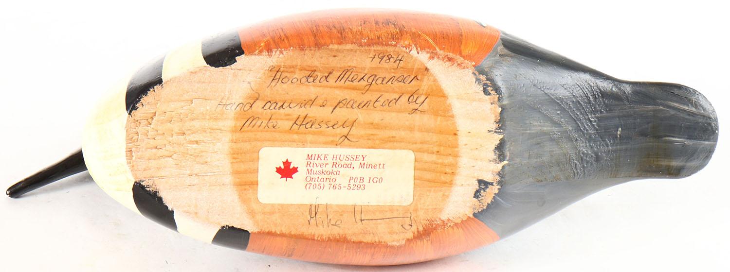 Hooded Merganser by Mike Hussey, River Road, Minett, Muskoka, Ontario, glass eyes, solid wood, original paint, structurally excellent, signed on bottom by MIKE HUSSEY. Grade: Excellent ++ - Value: 20 to 40