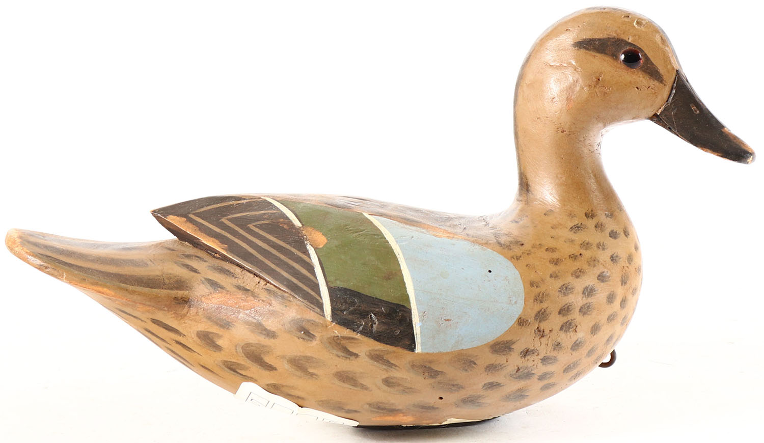 Blue Winged Teal Hen by unknown maker, glass eyes, hollow wood, original paint, structurally excellent. Grade: Excellent - Value: 16 to 30