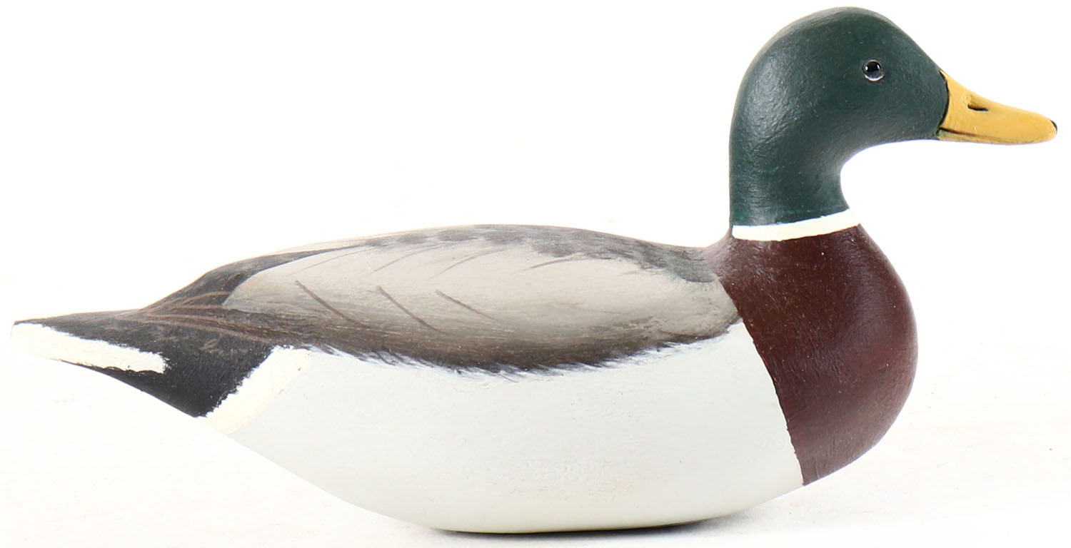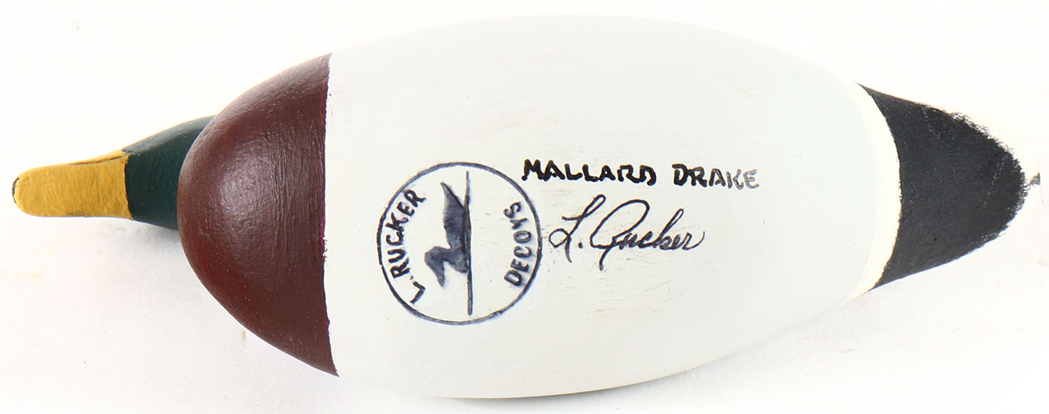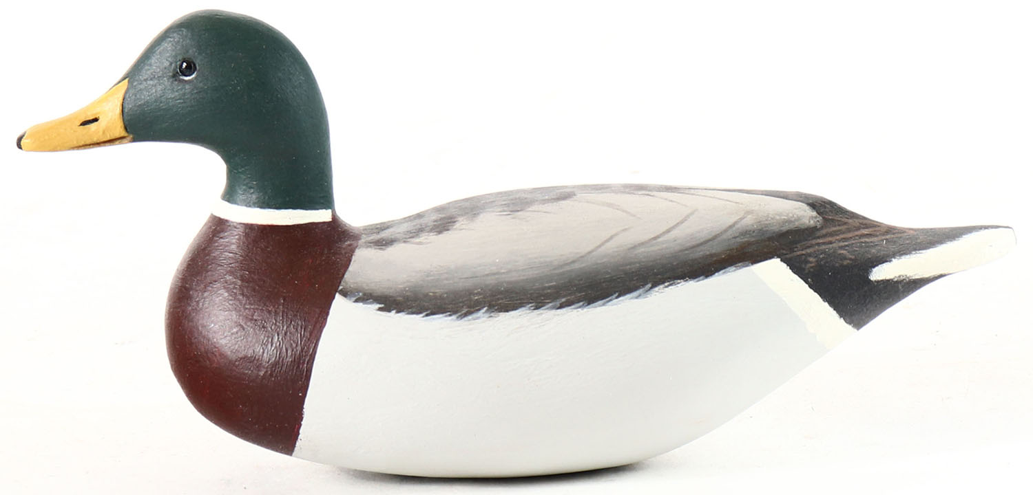 Miniature Mallard Drake by Larry Rucker, Maple Valley WA. Overall length 6-2/1 inches, glass eyes, solid wood. Grade: MINT - Value: 20 to 60