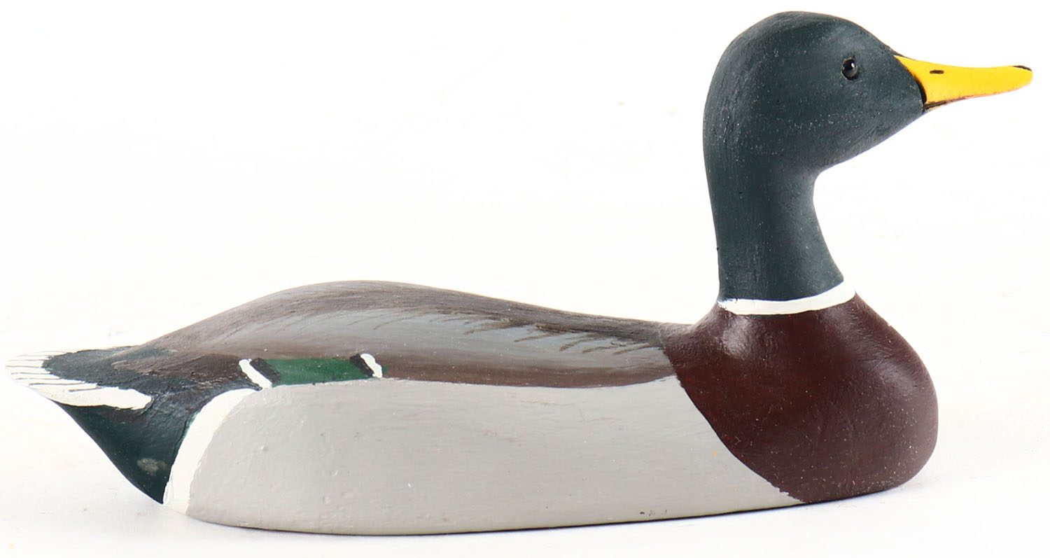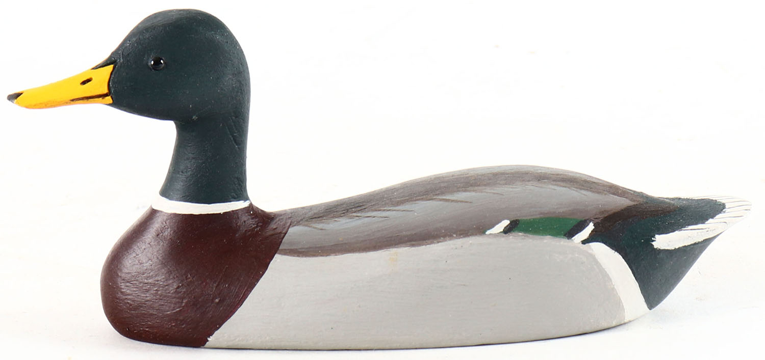 Miniature Mallard Drake by unknown maker, glass eyes, solid wood, painted by Larry Rucker, structurally excellent. Grade: Excellent ++ - Value: 10 to 80