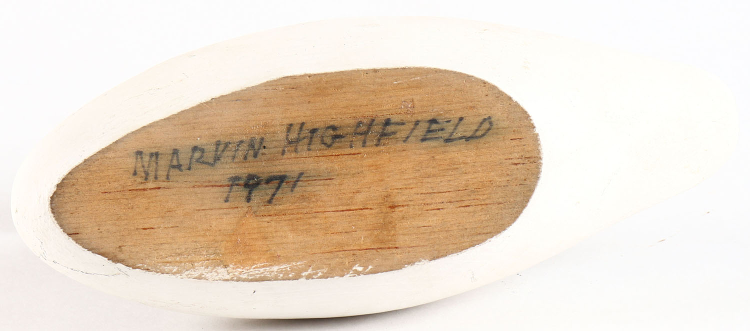 Swan by Marvin Highfield, glass eyes, solid wood, original paint, structurally excellent, signed on bottom. Grade: Excellent - Value: 2 to 60