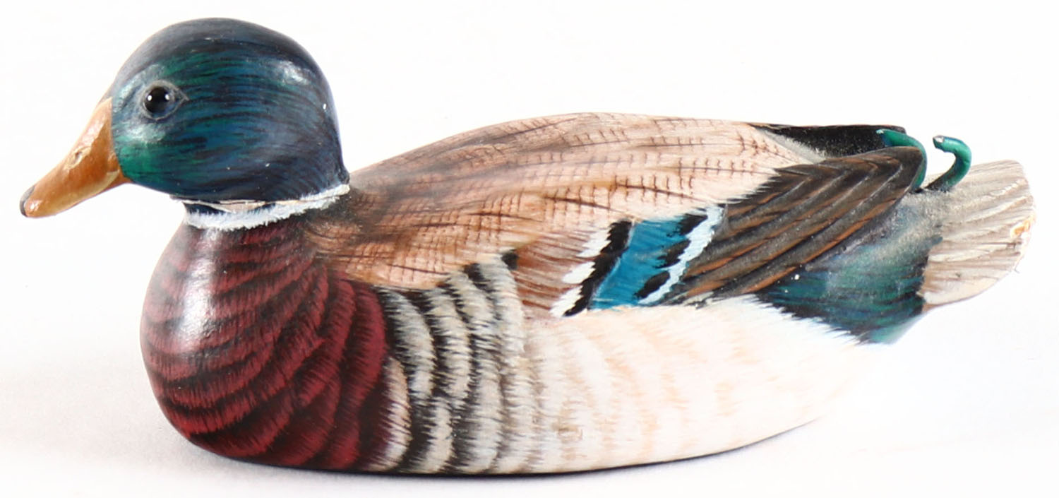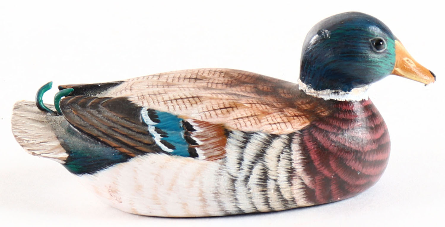 Miniature Mallard Drake by unknown maker, glass eyes, solid wood, original paint structurally excellent. Grade: MINT - Value: 6 to 30