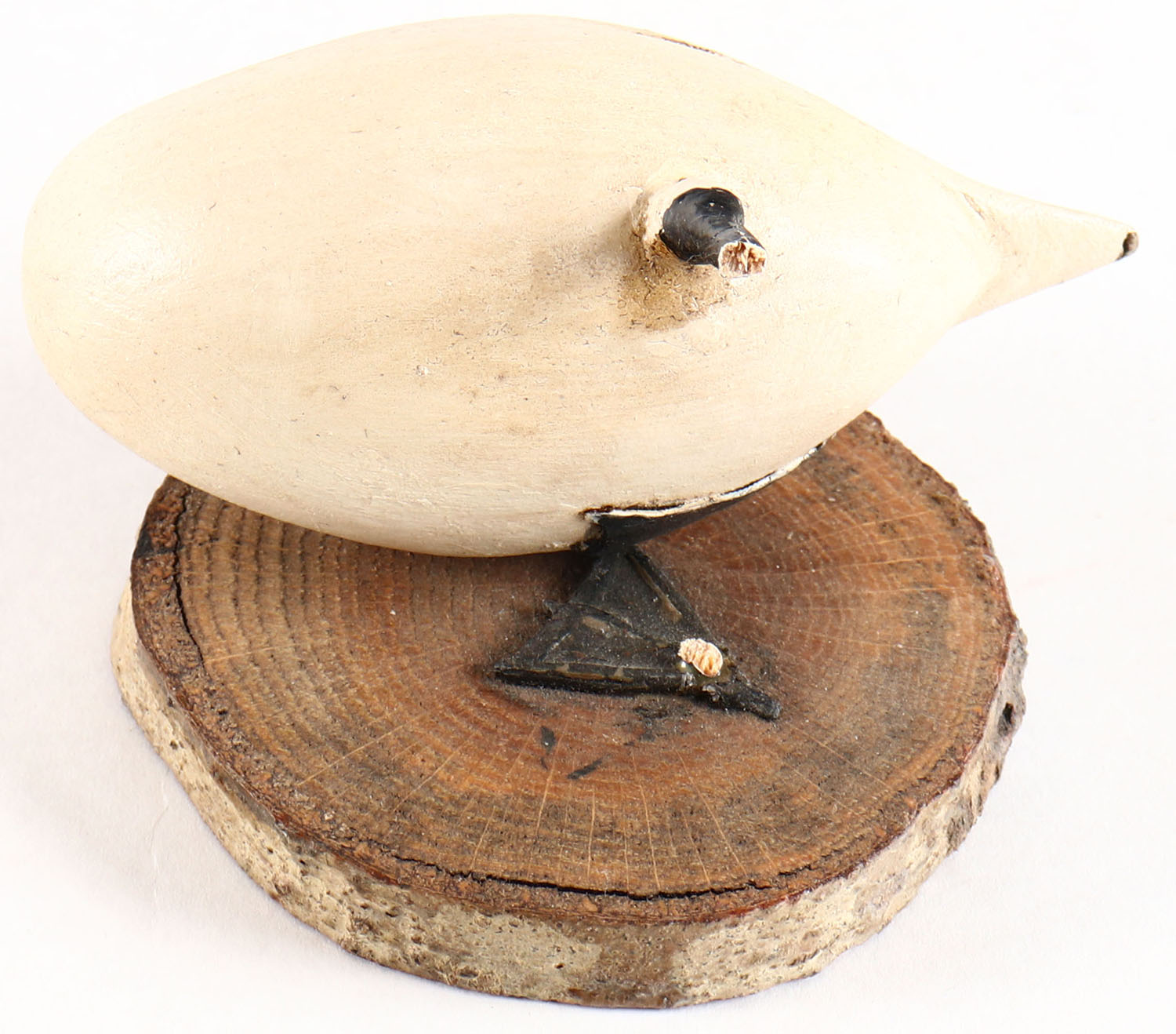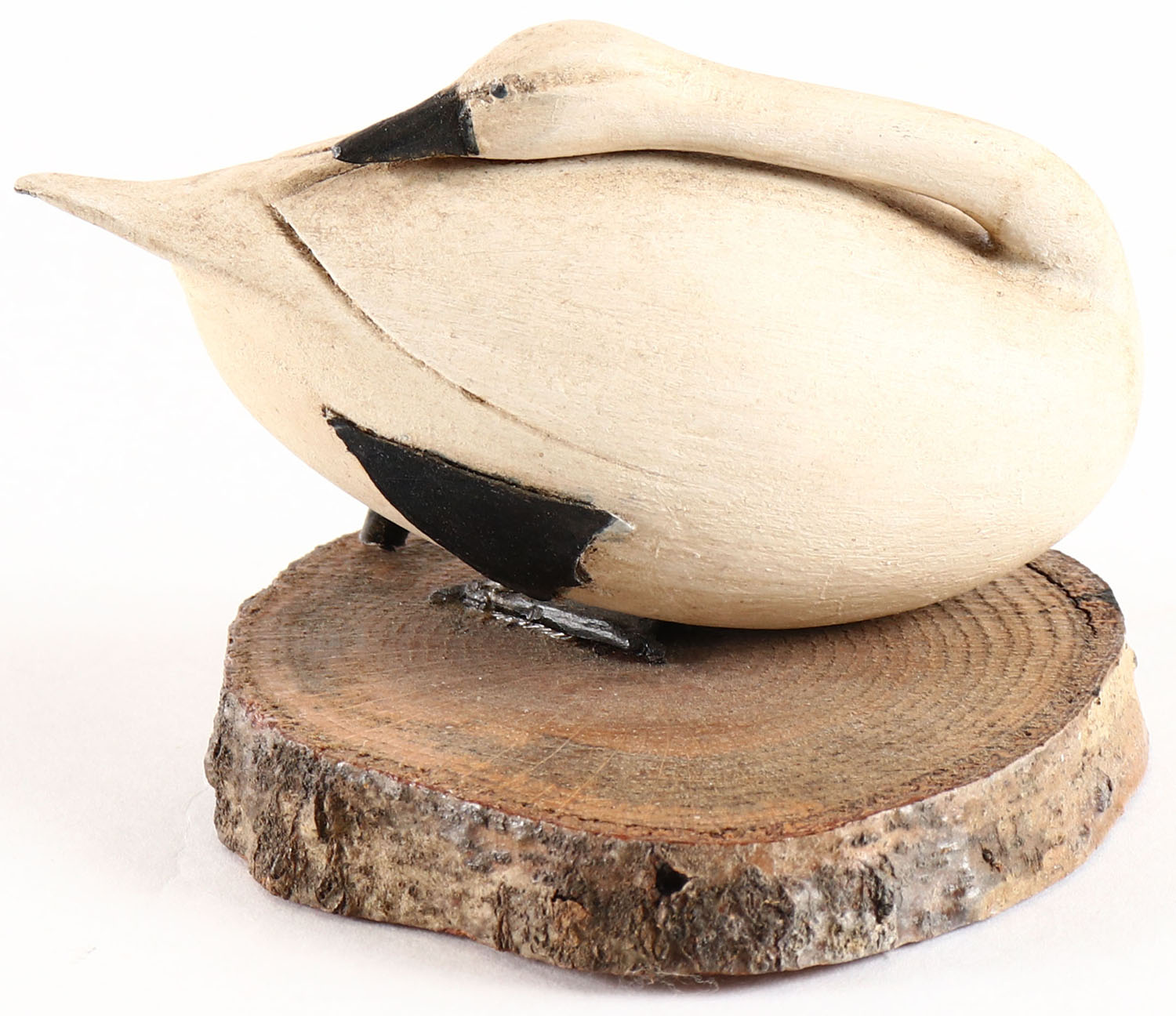 Miniature Swan by Paul Carter, painted eyes, solid wood, on wood stand, body broke off of wood stand. Grade: Fair - Value: 2 to 60