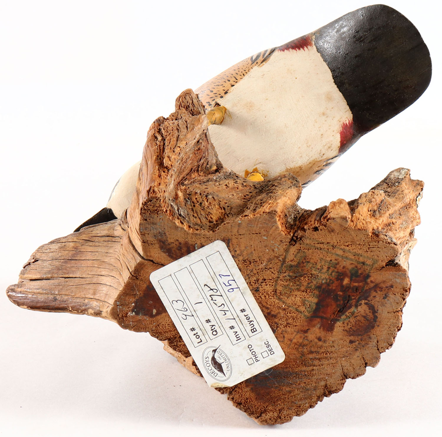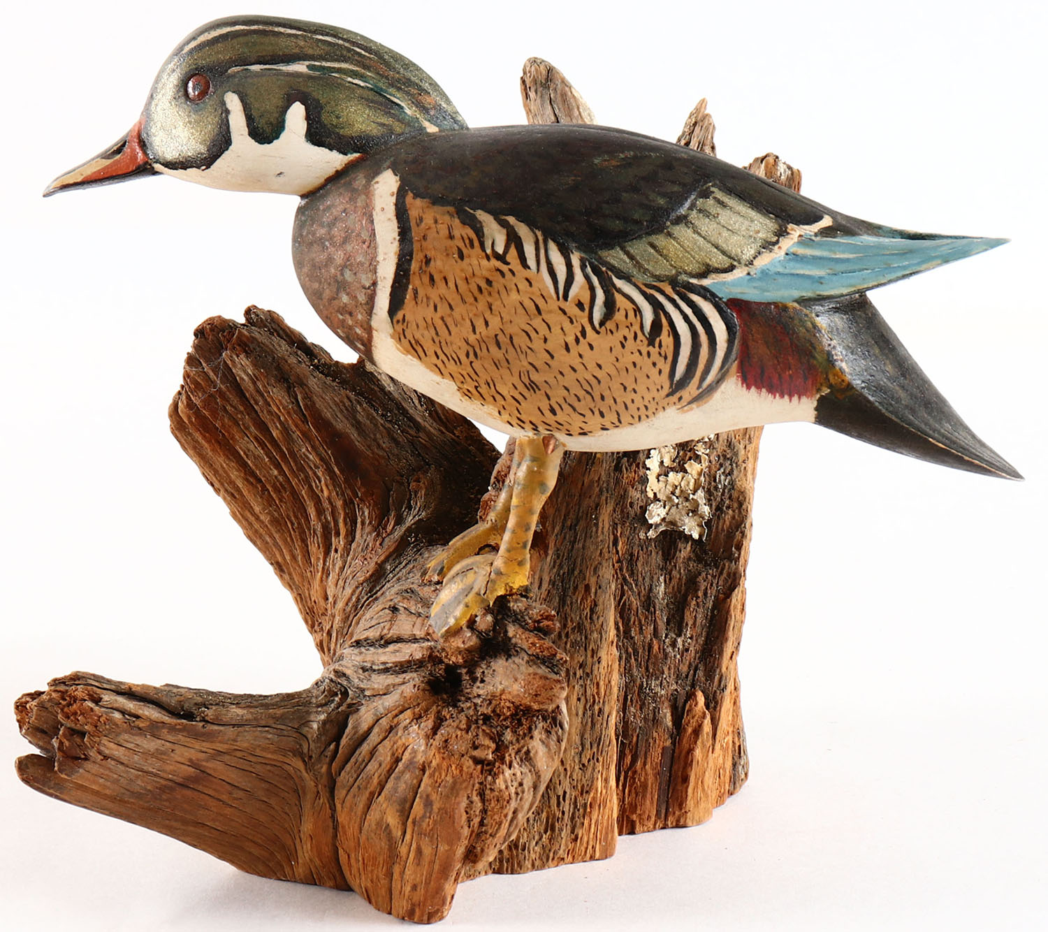 Woodduck Drake by Ducks Unlimited, on wood stand, glass eyes, solid wood, original paint, structurally excellent. Grade: Excellent ++ - Value: 10 to 60