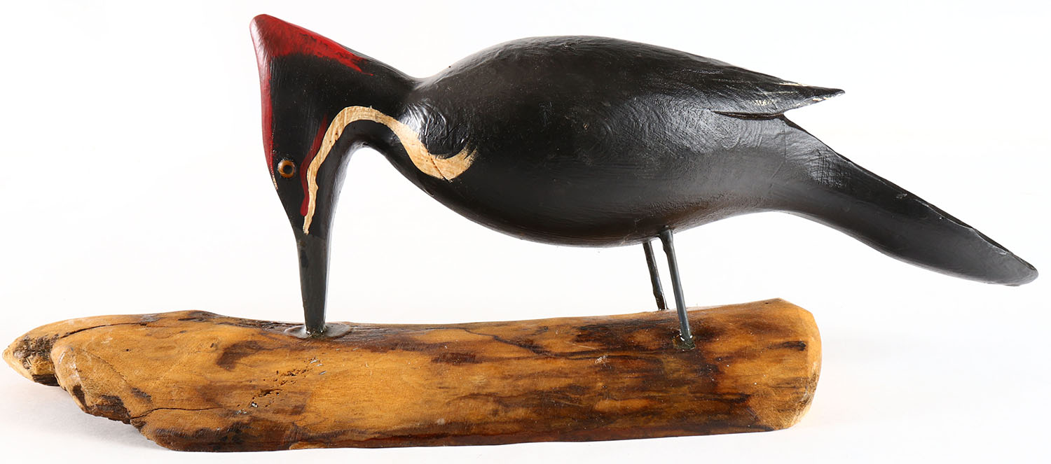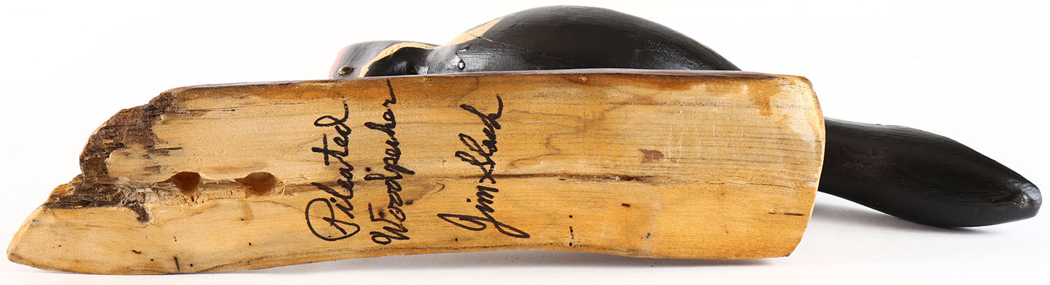Pileated Woodpecker by Jim Slack, tack eyes, solid wood on wood stand, original paint, structurally excellent, signed on bottom. Grade: Excellent + - Value: 10 to 60