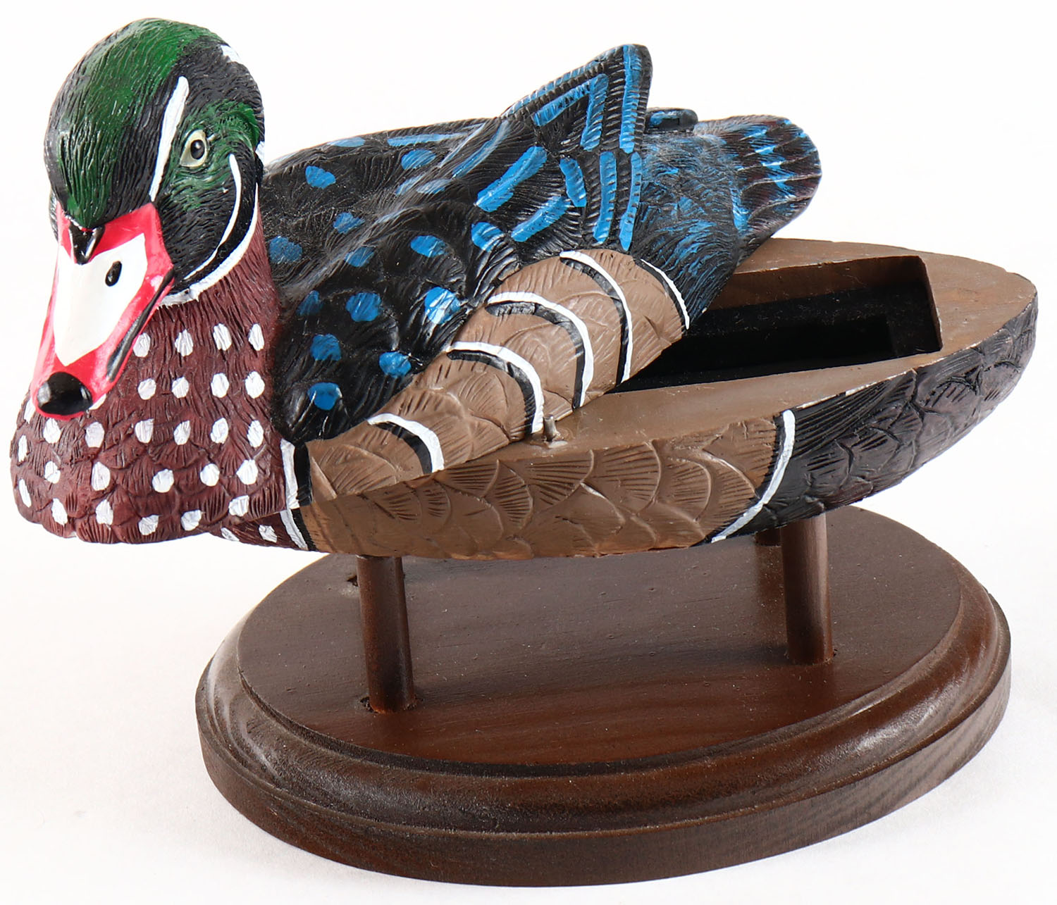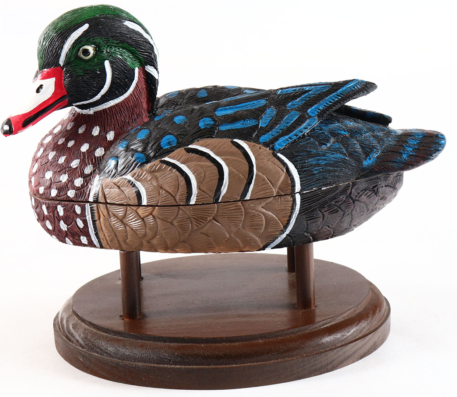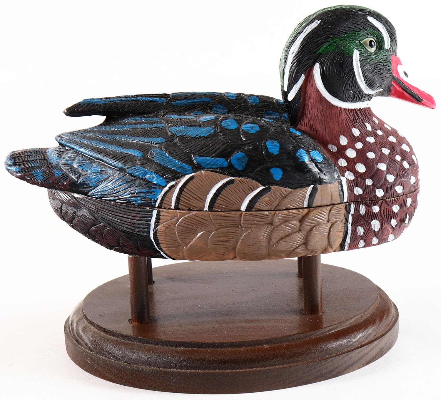 Woodduck Drake by unknown maker, glass eyes, solid wood on wood stand, original paint, structurally excellent. Grade: Excellent + - Value: 6 to 30
