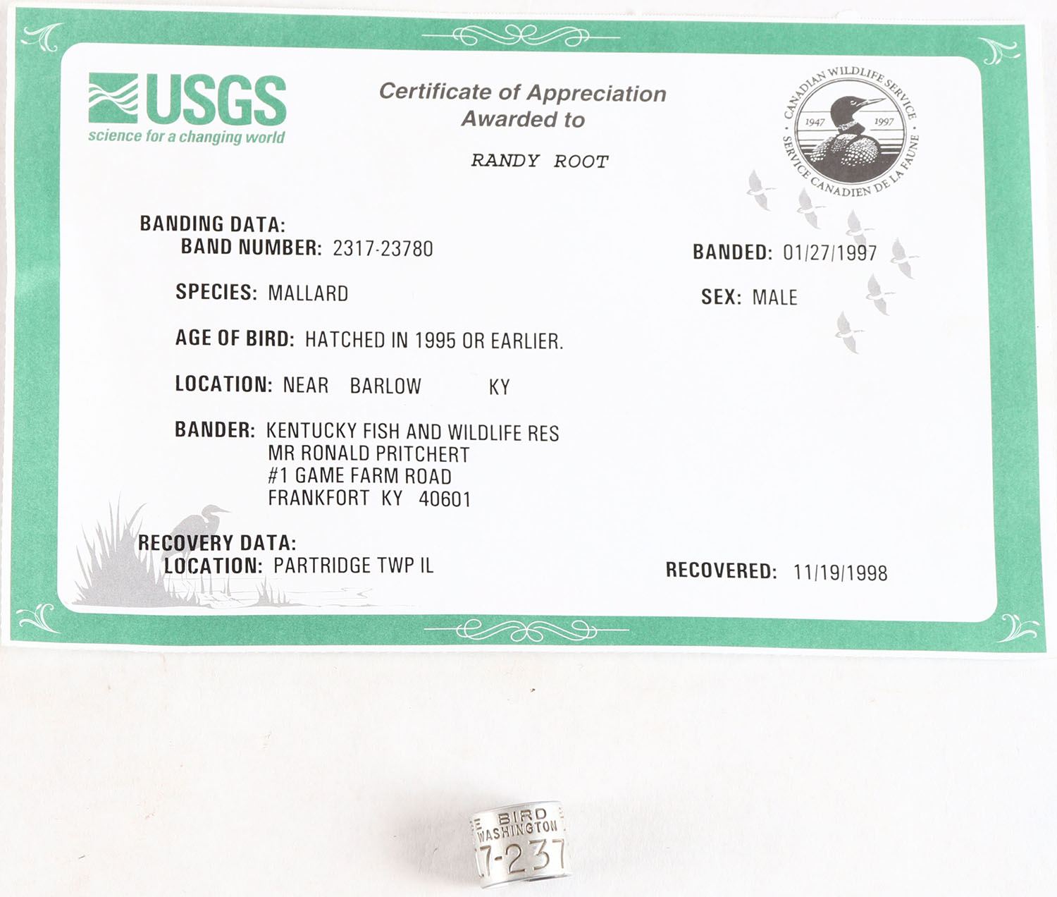 DUCK BAND with certificate from 1997 we are offering a few duck bands that were all shot at one duck club in Peoria IL from 1964 - 1999, ''MALLARD FARMS R R 2'', this one has a certificate, this one was banded NEAR Barlow KY 01/27/1997 and shot 11/19/98. Grade: Excellent - Value: 30 to 100