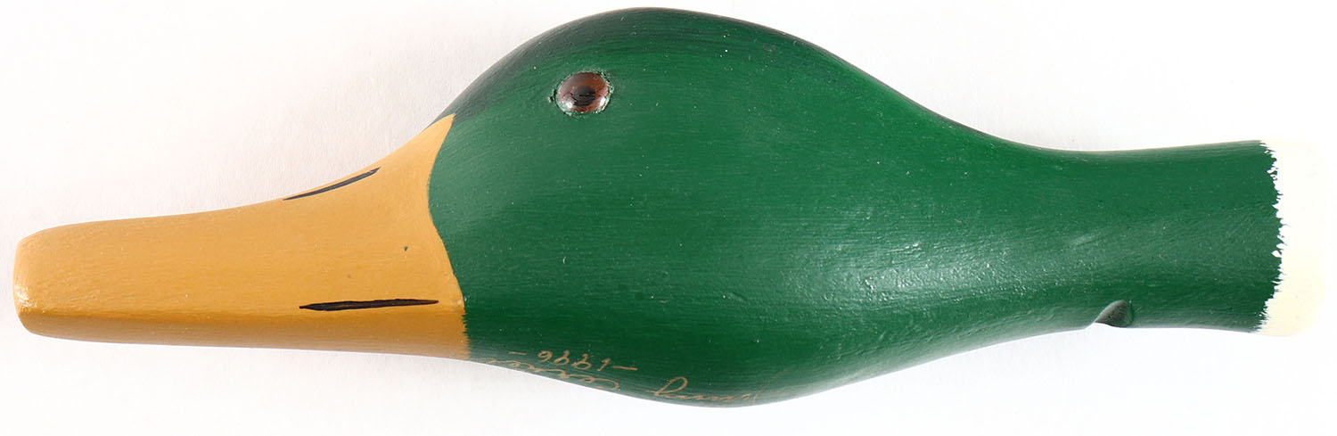 Mallard Duck Head call by Jimmy Cerreta, Phoenix AZ, this call is in the shape of a mallard ducks head & is signed & dated 1996, wonderful shape & perfect paint colors, sounds good. Grade: MINT - Value: 50 to 100