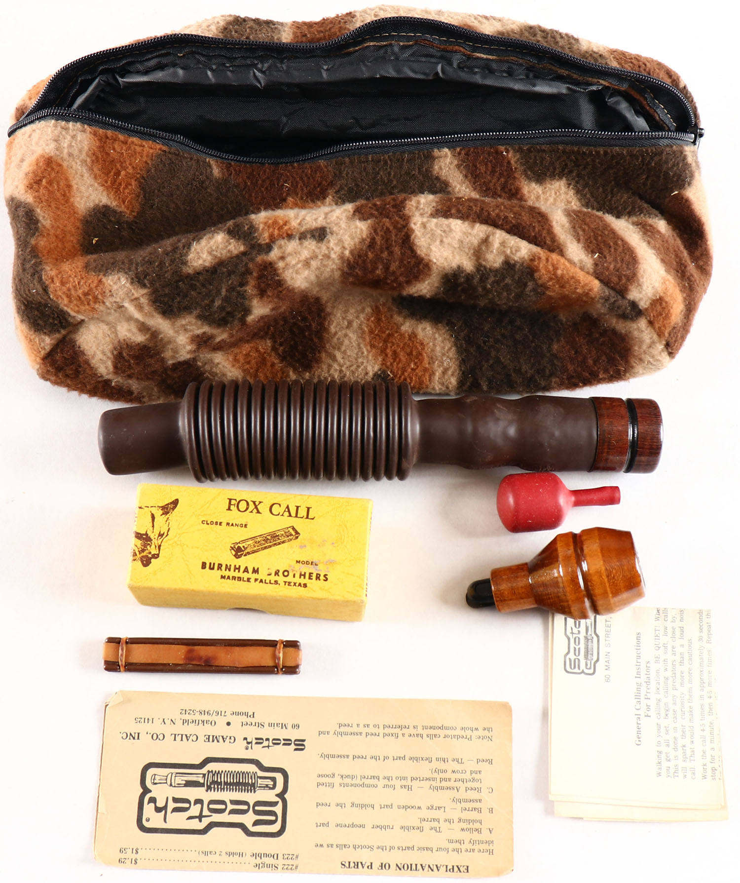 Lot of 4 predator calls in camo fanny pack, one Burnham Brothers Fox call in the box. Grade: Excellent - Value: 10 to 100