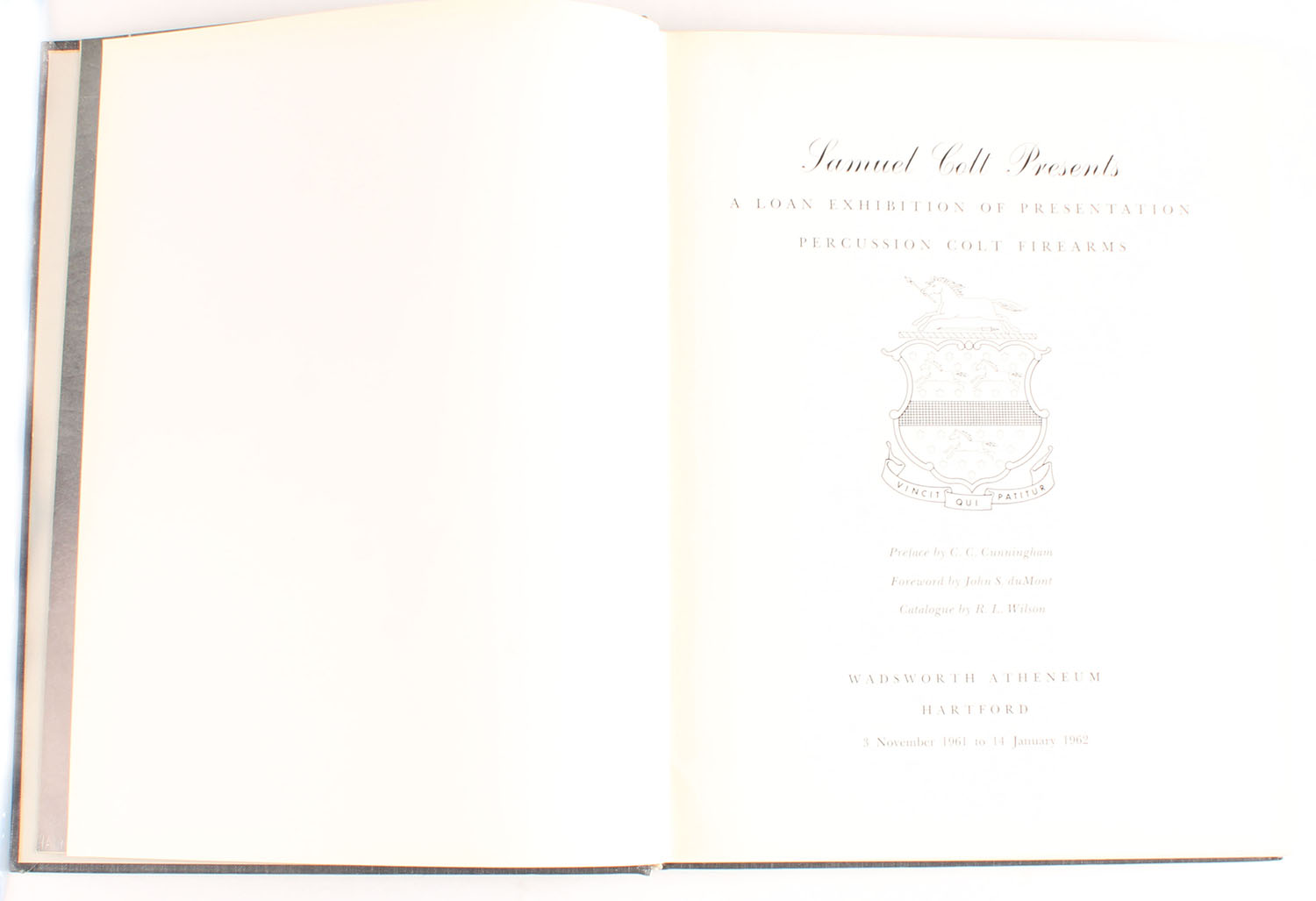 SAMUEL COLT PRESENTS. A Loan Exhibition of Presentation Percussion Colt Firearms. Wadsworth Atheneum, Hartford. 3 November 1961 to 14 January 1962, 8'' x 10 1/2''. 293 pages, pages clean, binding tight, hardcover very good, b/w images. Value: $175 Grade: Very Good ++ - Value: 20 to 175