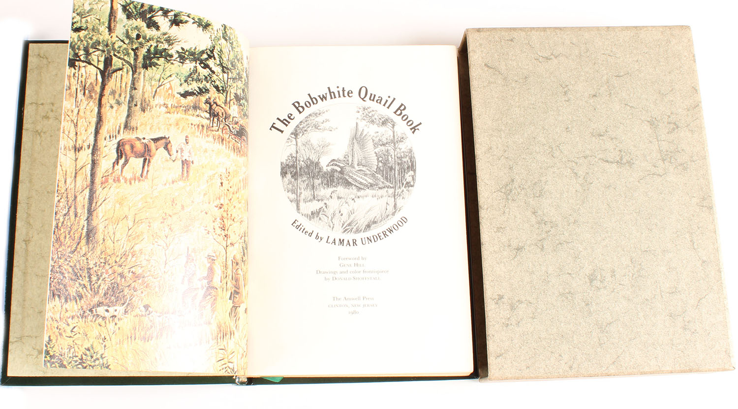 The Bobwhite Quail Book 1980 by Lamar Underwood, 6 1/2'' x 9 1/2''. 442 pages, pages clean, binding tight, hardcover mint, comes in hardcover book sleeve, green leatherette boards with gold embossing front and rear, gilt top, bottom, and fore-edge, Value: $100 Grade: MINT - Value: 10 to 100