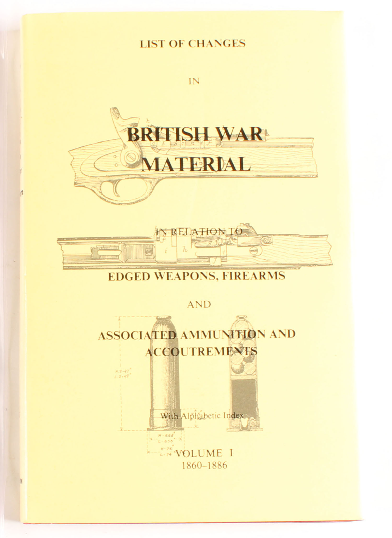 List Of Changes In British War Material In Relation To Edged Weapons, Firearms And Associated Ammunition And Accoutrements Volume 1 1860-1886 1980, 5 1/2'' x 8 1/2''. 170 pages, pages clean, binding tight, hardcover and dustjacket very good. Value: $50 Grade: Very Good ++ - Value: 2 to 50