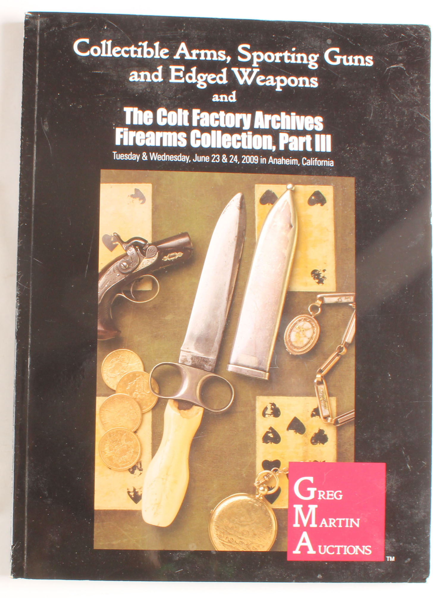 Collectible Arms, Sporting Guns and Edged Weapons and The Colt Factory Archives Firearms Collection, Part III 2009 Greg Martin Auctions, 9 1/2'' x 13''. 254 pages, pages clean, binding tight, softcover very good, colored images. Grade: Very Good ++ - Value: 2 to 100