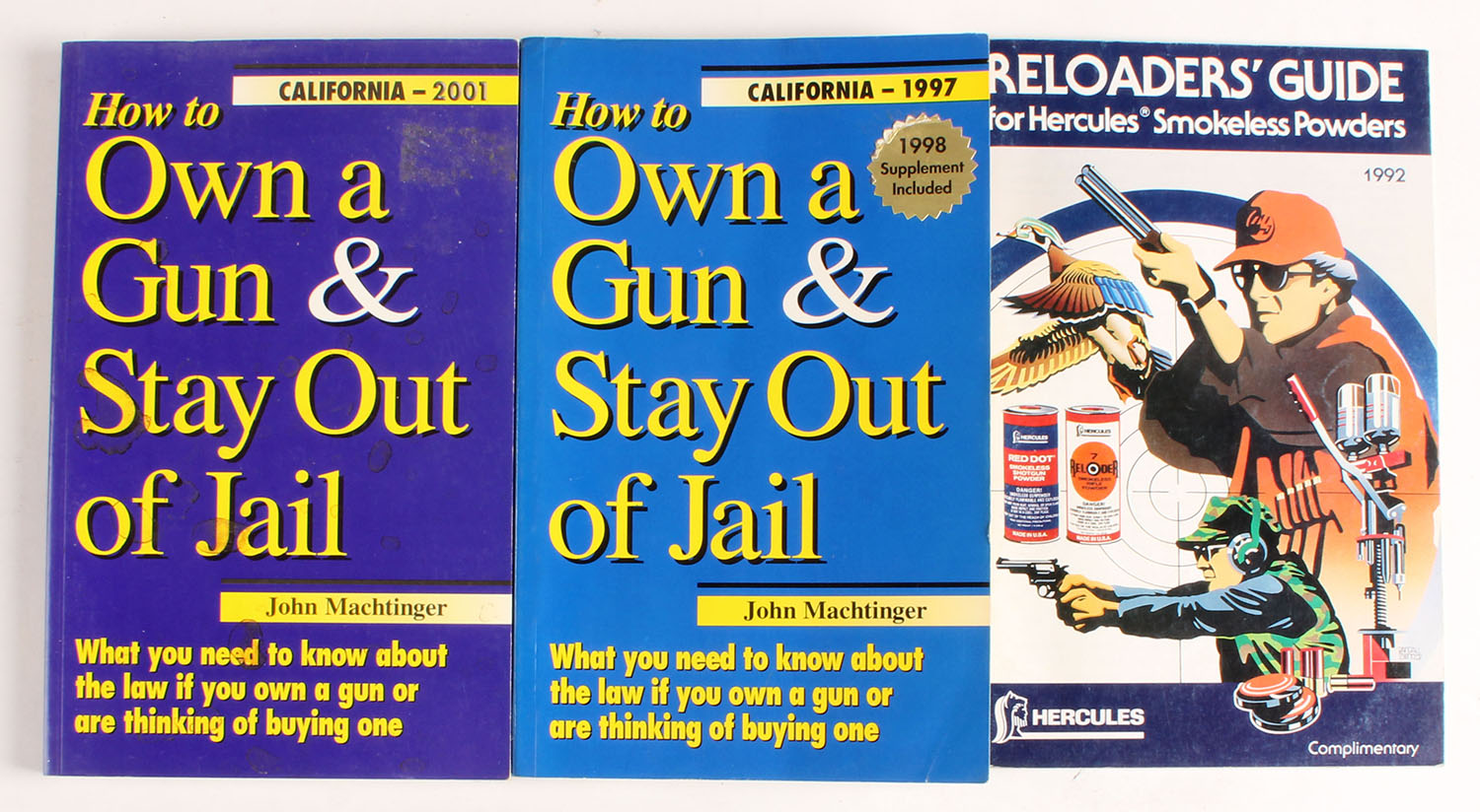 Lot of 3 (2) How to Own a Gun & Stay Out of Jail by John F. Machtinger (1) Reloading Guide for Hercules Smokeless Powders. All 5 1/2'' x 8'' softcovers excellent, pages clean, bindings tight. Value: $300 Grade: Excellent - Value: 10 to 300