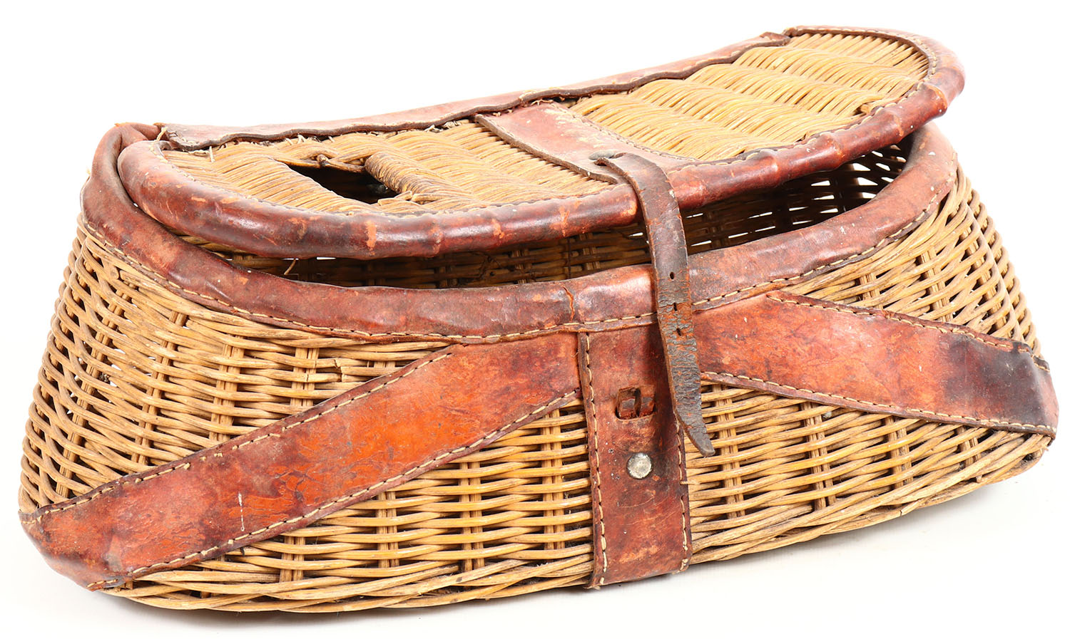 Unmarked fishing creel, Low Boy, 17'', front buckle is missing & back handle is torn, basket is solid. Grade: Very Good - Value: 20 to 80