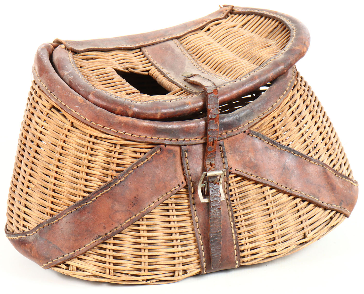 Unmarked fishing creel, 12 1/2'', Has ruler on top, carry handle is missing but front buckle & strap are intact. Grade: Very Good ++ - Value: 20 to 80