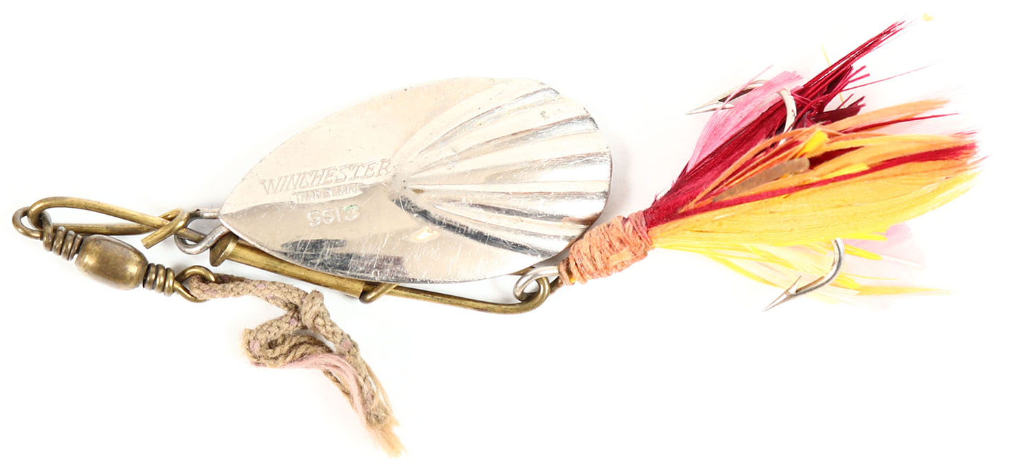 Winchester Fluted Trolling spoon No 9613, Nickel & red blade with feather teaser, 1 hook. Grade: Excellent - Value: 30 to 100