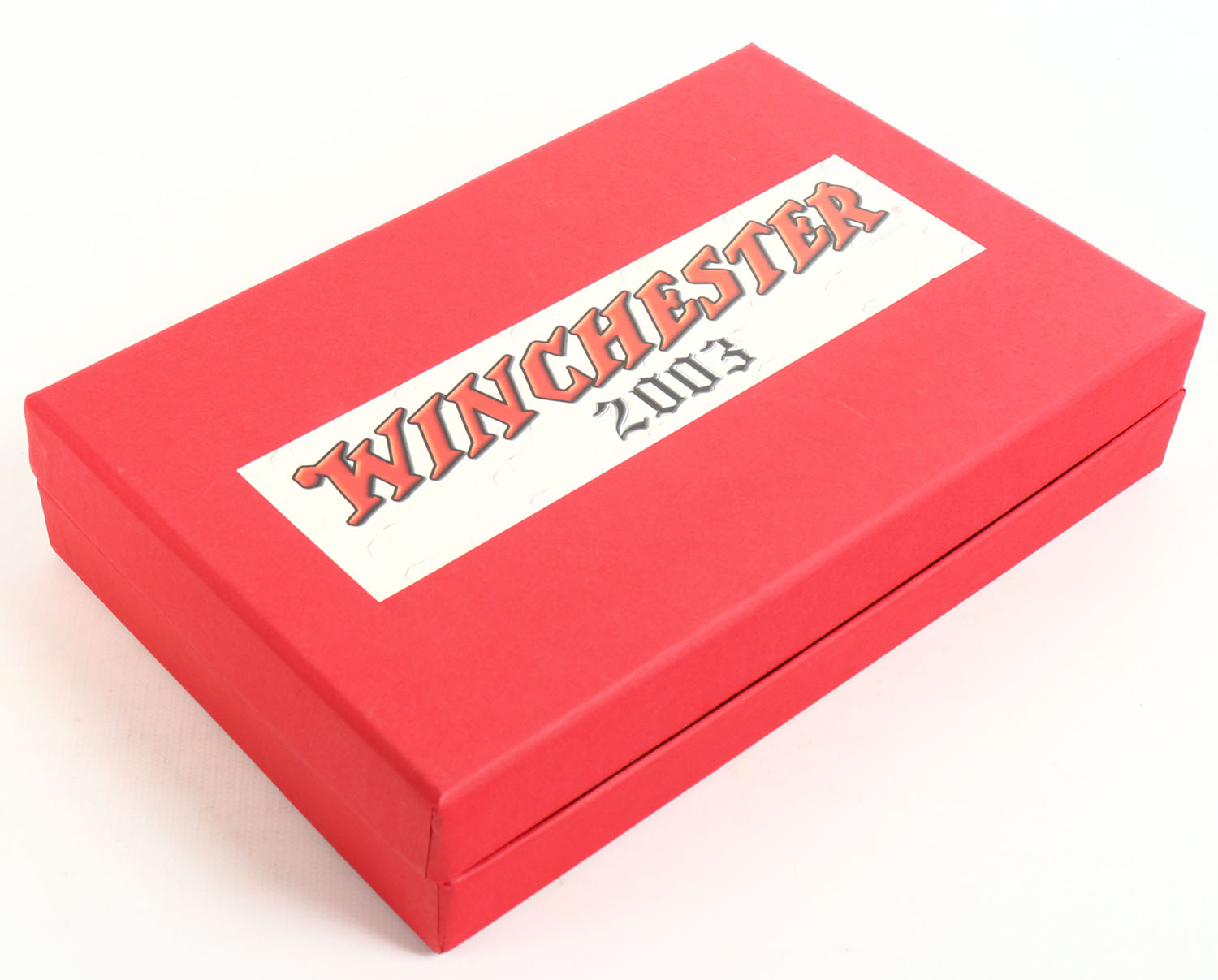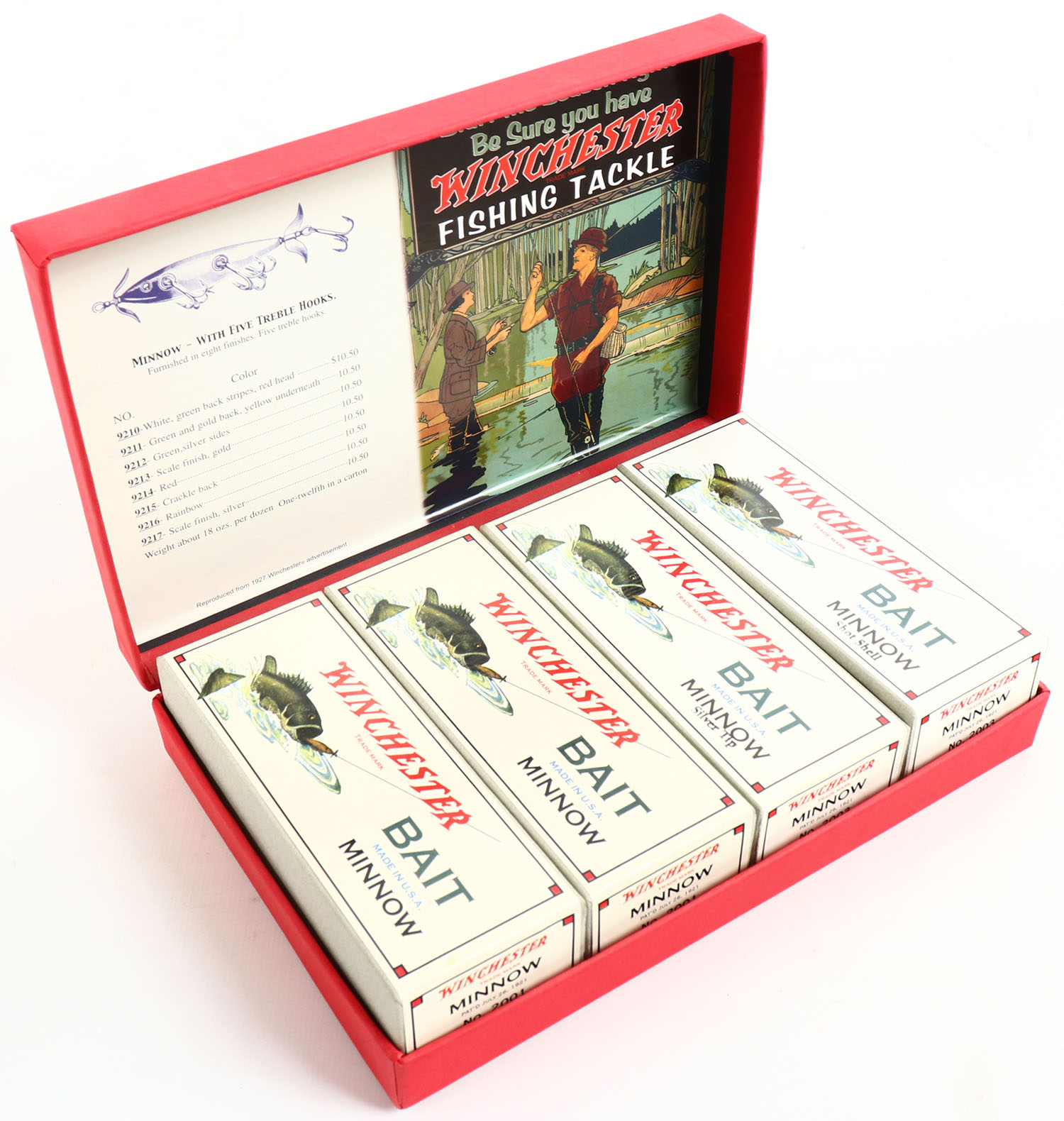 Full Case of Winchester 5 hook lures, 2003 Silver Tip, 2003 Shot Shell, 2001 Luminous Spotted Frog, 2001 Black Gold Scale, inside lid of case has a great fishing scene label. Grade: MINT - Value: 100 to 500
