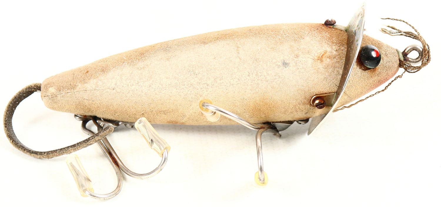 Heddon 210 Dowagiac Surface Minnow, has marked belly, gray mouse & black & red eyes, BE, 2 hook lure, Surface-Rig, leather tail, hard to find lure. Grade: Very Good ++ - Value: 30 to 80