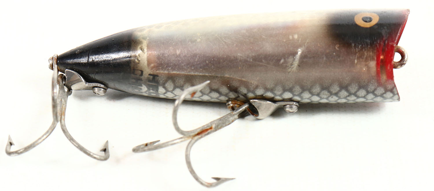 | Heddon Chugger, has marked belly, silver & black, PE, 2 hook lu...