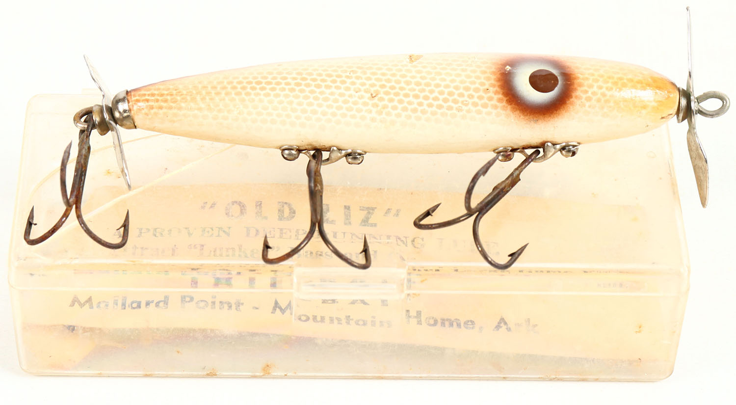Tate-Bait OLD LIZ lure in original box, white & brown scale, PE, 3 hook lure, surface rig hdw. Grade: Excellent - Value: 6 to 30