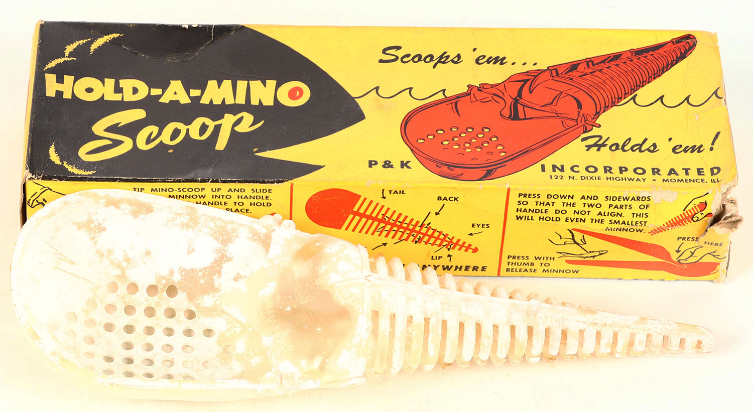 P&K HOLD-A-MINO SCOOP, in the original box, this lets you scoop up a minnow & helps you hold it while you bait your hook. Grade: Excellent - Value: 6 to 50