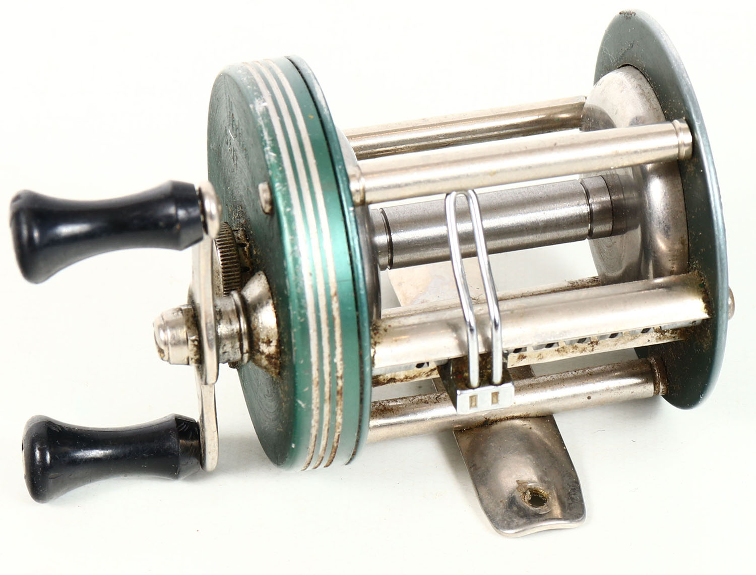 Heddon No. 20 Casting Bait Reel, no click, duel handle, shows wear to green sides. Grade; Very Good - Value: 2 to 30