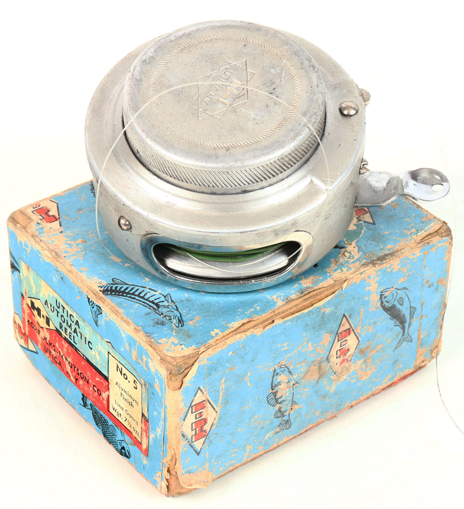 Horrocks-Ibbotson Co, Utica Auto Fly Reel, No 5 in the original box, works well. Grade: Very Good ++ - Value: 10 to 50