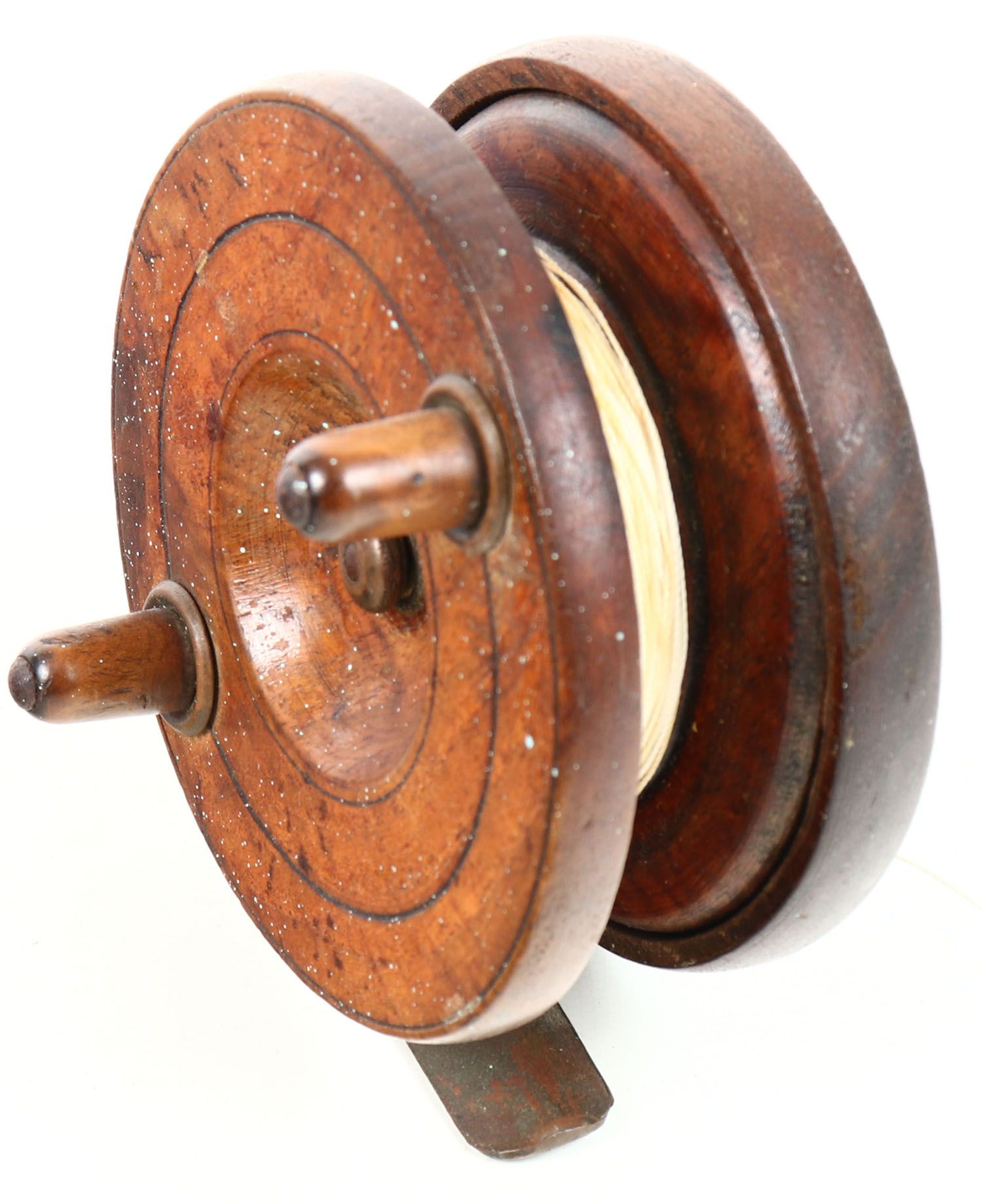 | Unmarked wood/brass fly reel, 3 7/8'' dia, dual wood handles. ...