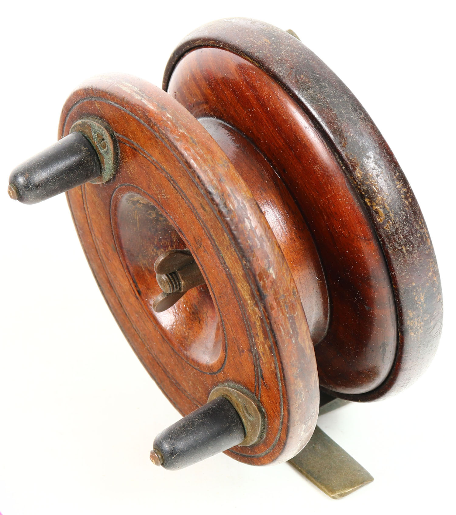 | Unmarked wood/brass fly reel, 4 3/8'' dia, dual wood handles. ...